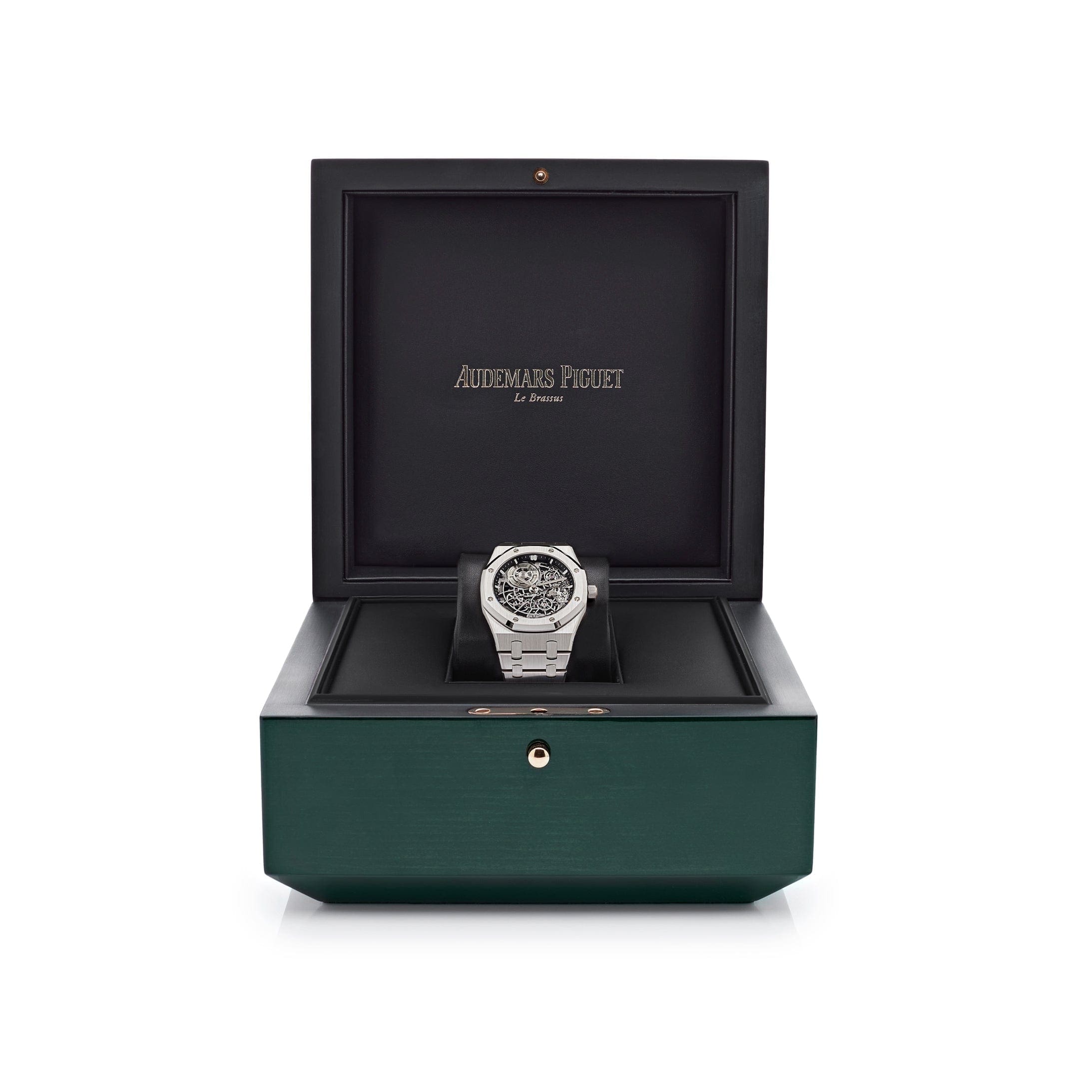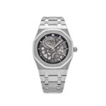 The Audemars Piguet 16204BC.OO.1240BC.01 is crafted in a 39mm white gold case and styled on matching white gold bracelet. The dark gray hues of intricate mechanics of Caliber 7124 are showcased in the dial. Meant to be admired on both sides of the watch, the sapphire crystal and exhibition case back provide a unique view into the heart of the piece.