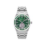 The Audemars Piguet Selfwinding is designed in a 41mm titanium case and styled on matching bracelet. The emerald green dial embossed with a Evolutive Tapisserie pattern is enhanced by a white gold bezel set with green emeralds. At 6 o’clock sits the skeleton view of the watches tourbillon complication. An exhibition case back offers a glimpse into the movement powering the Flying Tourbillon and basic timekeeping functions.