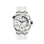 The Diver in a sleek white edition features a robust 42mm stainless steel case with a 300m water resistance, making it ideal for underwater exploration. The white dial, adorned with a “M??ga Tapisserie” pattern, showcases white gold hour-markers and Royal Oak hands. The rhodium-plated hands and black rubber-clad screw-locked crowns add sophistication, while the rotating inner bezel aids diving functionality. Powered by an automatic movement, this watch is in great pre-owned condition and includes an extra rubber strap, original box, and papers. A perfect blend of style and functionality.