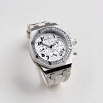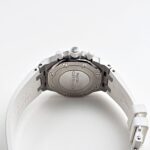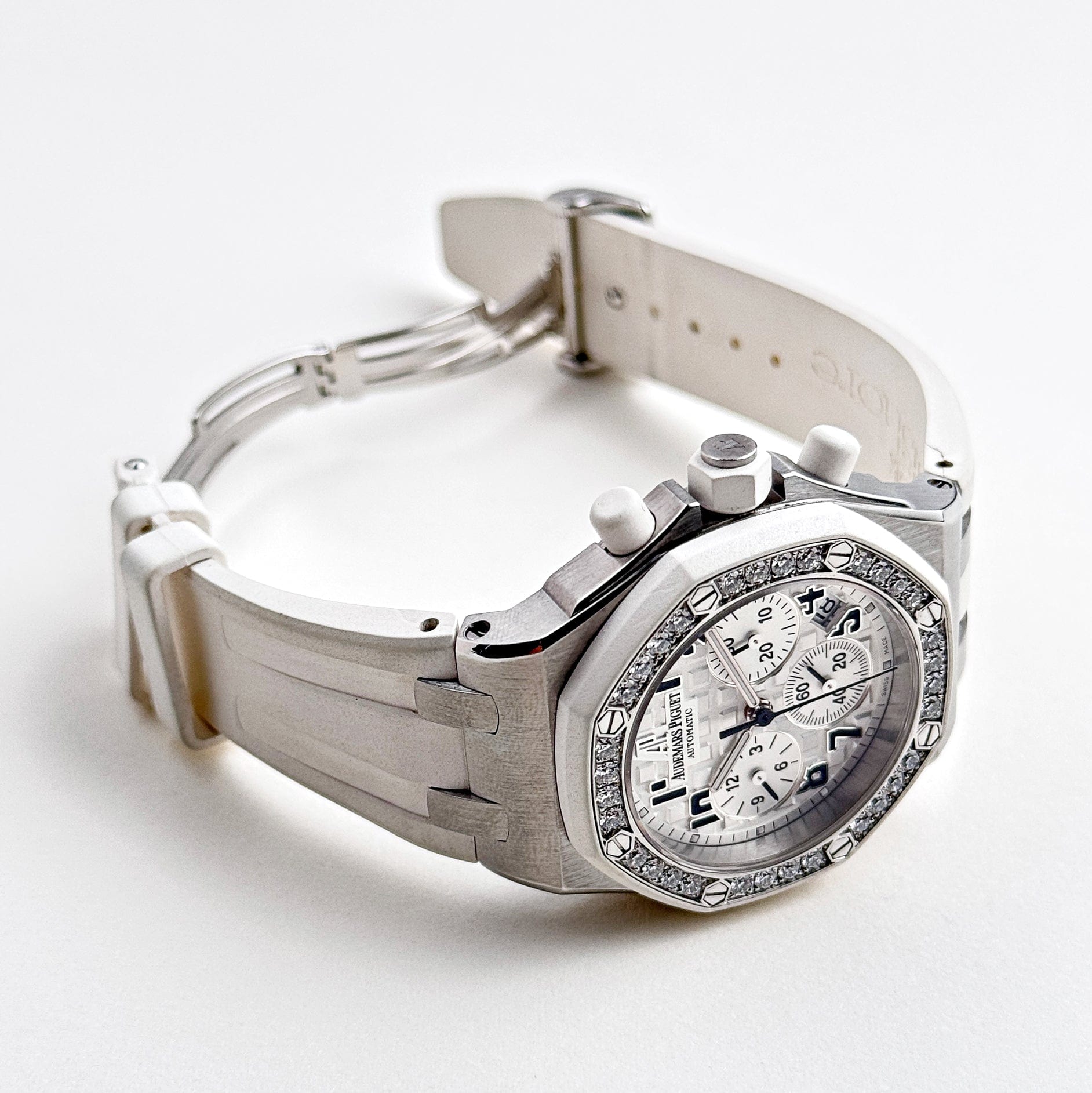 The Audemars Piguet 26048SK.ZZ.D010CA.01 redefines sporty elegance with its striking diamond-set bezel and robust stainless steel case. The white dial, accented with signature “Mega Tapisserie” detailing, complements the sporty aesthetic, while the rubber strap ensures a comfortable and versatile fit. A perfect blend of sophistication and functionality, this timepiece stands out as a statement of refined luxury.
