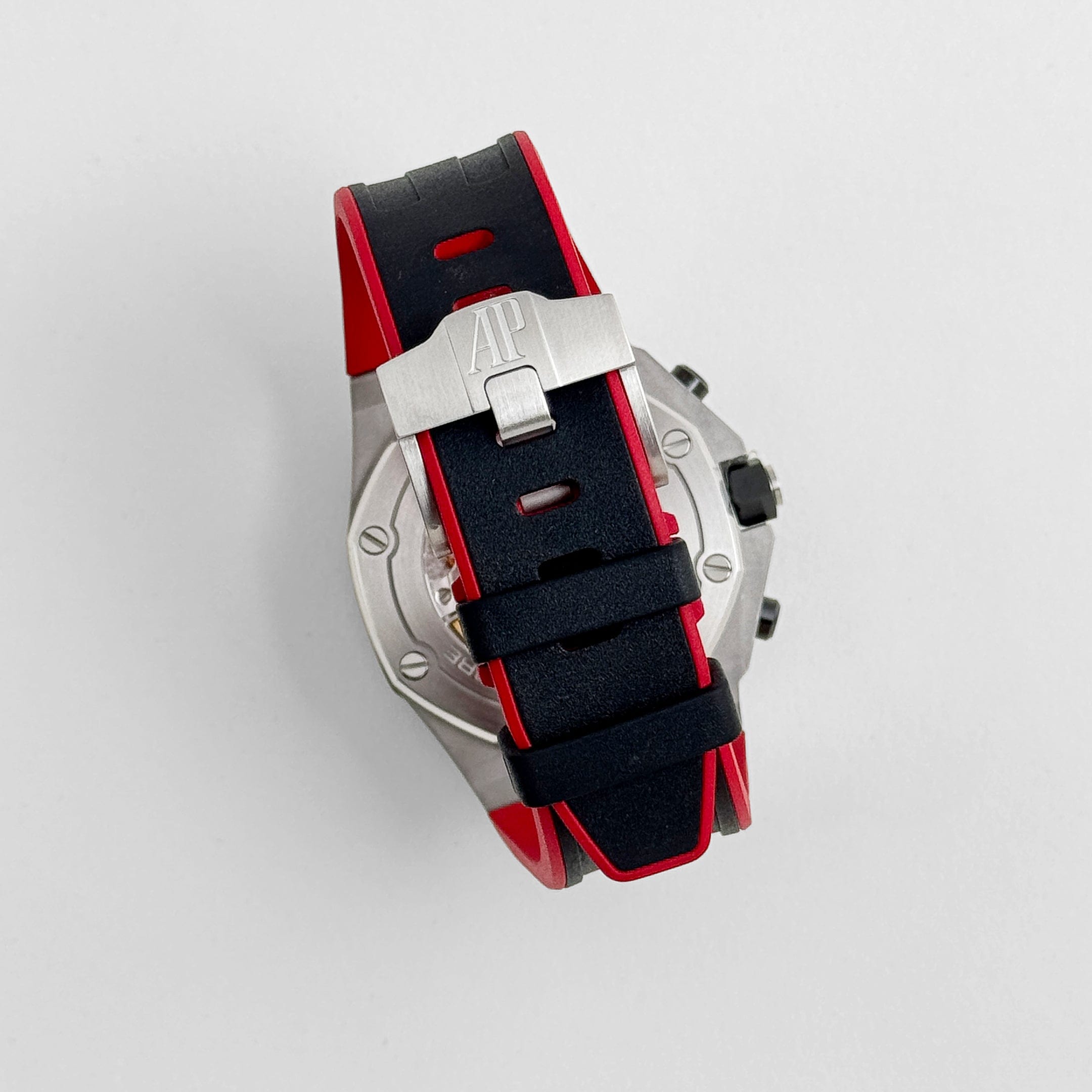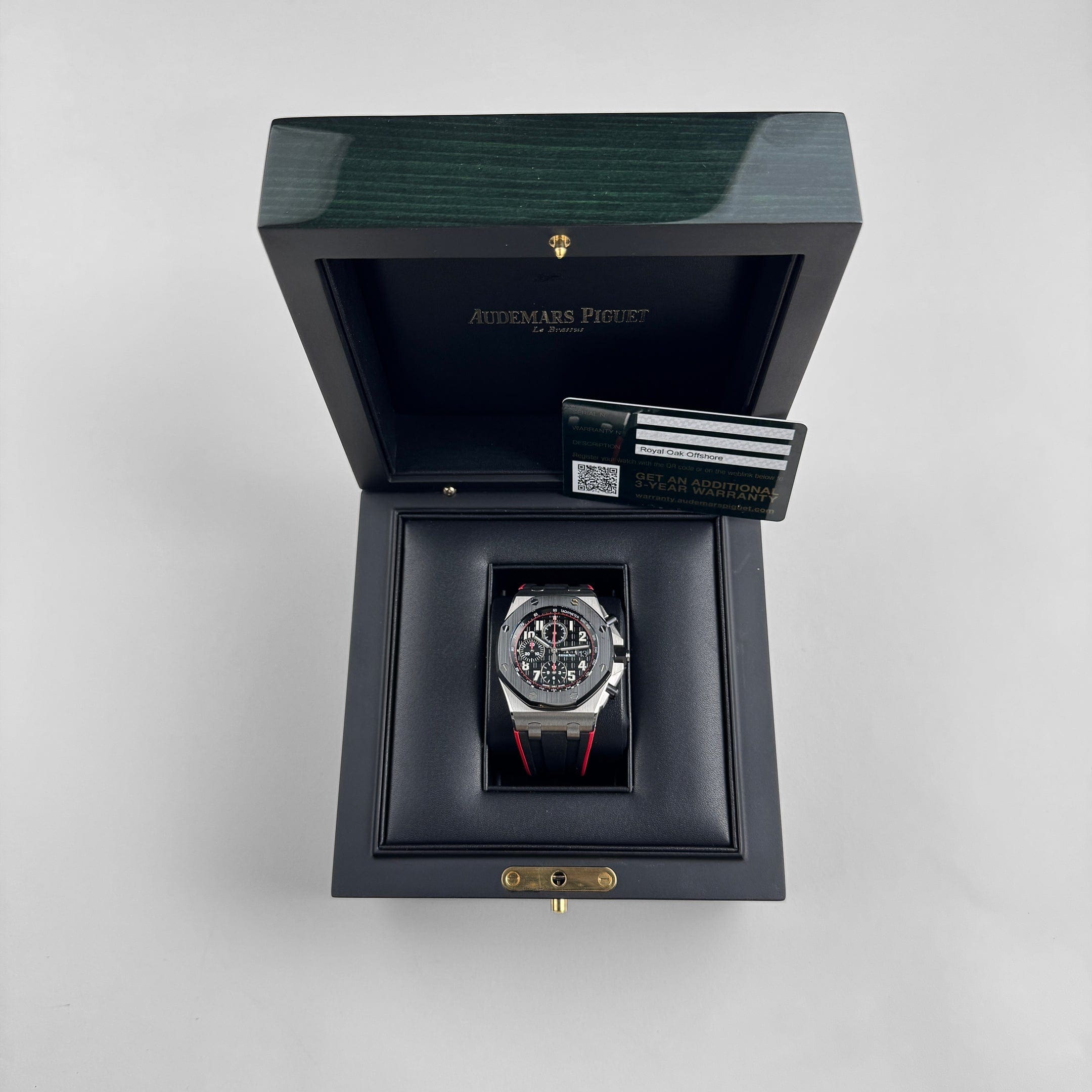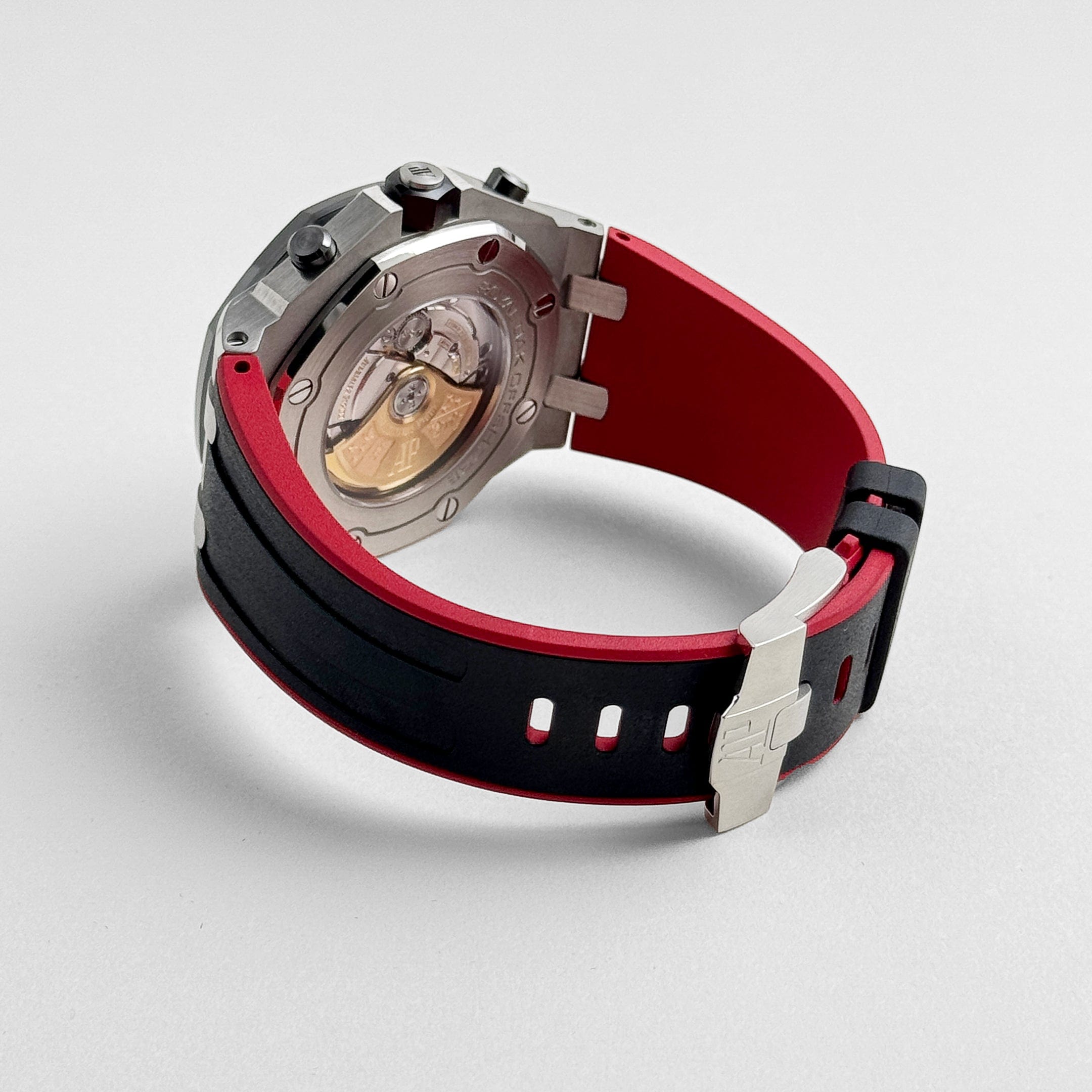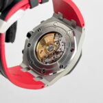 The watch is paired with a black ceramic bezel and matching pushers and crown, giving it extra resilience and a sleek, modern feel. The rubber strap completes the aggressive aesthetic. Powered by the selfwinding Calibre 3126/3840, the ??Vampire?? is a collector-favorite among Offshore variants for its unapologetically bold colorway and sharp detailing.