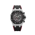 The Audemars Piguet 26470SO.OO.A002CA.01, nicknamed the ??Vampire,?? blends bold aesthetics with rugged construction. This 42mm stainless steel chronograph features a black ??M??ga Tapisserie?? dial accented by red chronograph hands and red indices on the subdials??hence the vampiric moniker. The contrast of deep black and blood red adds drama to the signature Royal Oak Offshore look.