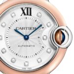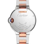 Ballon Bleu de Cartier watch, 33 mm, mechanical movement with automatic winding. Steel case, rose gold 750/1000 bezel, rose gold 750/1000 fluted crown set with a cabochon synthetic spinel. Silver guilloch dial set with 11 brilliant-cut diamonds totaling 0.05 carat. Blued-steel sword-shaped hands. Sapphire crystal. Rose gold 750/1000 and steel interchangeable bracelet. Case thickness: 9. 96 mm. Water-resistant up to 3 bar (approx. 30 meters/100 feet).
