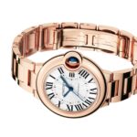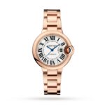 Ballon Bleu de Cartier watch, 33 mm, mechanical movement with automatic winding. Rose gold 750/1000 case and fluted crown set with a cabochon sapphire. Silver guilloch?? dial. Blued-steel sword-shaped hands. Sapphire crystal. Rose gold 750/1000 interchangeable bracelet. Case thickness: 10.16 mm. Water-resistant up to 3 bar (approx. 30 meters/100 feet). Floating like a balloon and as blue as the cabochon safely nestled in its side, the Ballon Bleu watch by Cartier adds a dash of elegance to male and female wrists alike. Roman numerals are guided on their path by a deep blue winding mechanism. With the convex curves of the case, guilloch?? dial, sword-shaped hands, and polished or satin-finish links of the bracelet…the Ballon Bleu watch by Cartier floats through the world of Cartier watchmaking.