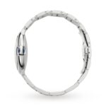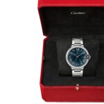 Ballon Bleu de Cartier watch, 40 mm, Manufacture mechanical movement with automatic winding, caliber 1847 MC. Steel case, fluted crown set with a synthetic cabochon-shaped spinel, blue sunray-brushed dial, silvered sword-shaped hands, sapphire crystal, interchangeable steel bracelet, calendar aperture at 3 o’clock. Thickness: 12.4 mm. Water-resistant up to 3 bar (approx. 30 meters/100 feet).