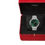 The Ballon Bleu de Cartier watch boasts a 40 mm mechanical movement with automatic winding courtesy of the 1847 MC. The ste el case is paired with a fluted steel crown featuring a synthetic cabochon-shaped spinel. A sunray brushed dark green dial is adorne d with silvered sword-shaped hands, all protected by a sapphire crystal. The accompanying interchangeable steel bracelet adds versat ility, while a calendar aperture at 3 o’clock and water-resistance up to 3 bar (approx. 30 metres) make this timepiece both function al and fashionable.
