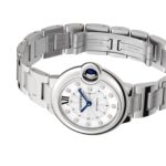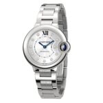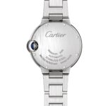Ballon Bleu de Cartier – balance and harmony Characterised by seamless curves and the collection’s signature round form Elegant silver guilloche set with 11 brilliant cut diamonds totalling 0.05 carat Housed in a 33mm steel case with Cartier’s iconic fluted steel crown set with a blue cabochon-shaped spinel Powered with precision by a self-winding mechanical movement THE ART OF HARMONY Since its debut in 2007, the Ballon Bleu de Cartier has become a true Cartier icon . Its visionary round design achieves balance in both structure and fluidity. The blue sapphire cabochon set within the crown resembles a floating blue balloon – a hallmark of the collection. ELEGANCE AND FLUIDITY Radiating luxury, this model features an elegant silver guilloche dial adorned with 11 glistening diamonds that dance under the light. The 33mm steel case embodies the collection’s distinct curved form, while the signature blued- steel sword-shaped hands and fluted steel crown set with a sapphire cabochon provide a nod to classic Cartier styling. Merging comfort and sophistication, this models fastens with an interchangeable steel bracelet, while power and precision are provided by a reliable self-winding mechanical movement.