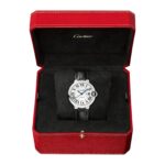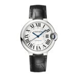 Ballon Bleu de Cartier watch, 36 mm, mechanical movement with automatic winding. Steel case, fluted crown set with a cabochon synthetic spinel. Silver guilloch opaline dial. Blued-steel sword-shaped hands. Sapphire crystal. Black alligator leather strap, steel interchangeable deployant buckle. Case thickness: 12.1 mm. Water-resistant up to 3 bar (approx. 30 meters/100 feet).