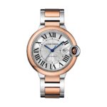 The exquisite Ballon Bleu de Cartier watch boasts a 42 mm size and a powerful mechanical movem ent with automatic winding, thanks to the calibre 1847 MC. Its stunning steel case and rose gold 750/1000 bezel, along with the flut ed rose gold 750/1000 crown adorned with a synthetic cabochon-shaped spinel, make for a luxurious and eye-catching design. The silve red guilloch?? dial features blued-steel sword-shaped hands, while the sapphire crystal and calendar aperture at 3 o’clock add functi onality. The interchangeable two-tone bracelet adds versatility. With a thickness of 13 mm and water-resistance of up to 3 bar (appr ox. 30 metres), this watch is the epitome of both style and function.