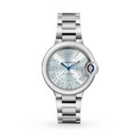 Ballon Bleu de Cartier watch, 33 mm, mechanical movement with automatic winding. Steel case, fluted crown set with a synthetic cabochon-shaped spinel, blue silvered sunray-brushed dial, blued-steel sword-shaped hands, sapphire crystal, interchangeable steel bracelet. Thickness: 9.96 mm. Water-resistant up to 3 bar (approx. 30 meters/100 feet).