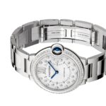 Ballon Bleu de Cartier – Constantly seeking harmony Inspired by a new vision of roundness Elegant sunray grey dial set with 21 brilliant cut diamonds Presented in a 36mm steel case secured with an interchangeable steel bracelet Powered by a reliable self- winding movement with a 37-hour power reserve IN SEARCH OF HARMONY Created in 2007, the Ballon Bleu de Cartier rapidly became a Cartier icon. Inspired by a new vision of roundness, the shape strikes the perfect balance between line and volume. Set with a blue sapphire cabochon, the perfectly integrated winding crown gives the illusion of a floating blue balloon, resulting in the name Ballon Bleu. A NEW VISION OF ROUNDNESS Characterised by its fluid lines and distinct round shape, this 36mm model is encased in steel and secured with an interchangeable steel bracelet. Framed by a bezel set with 54 diamonds totalling 0.78 carats, the sunray grey dial is truly radiant. A further 21 diamonds radiate out from the centre, complimenting the dial’s ray-like pattern, while the Maison’s iconic blued-steel sword-shaped hands add a familiar sense of luxury. Powered with precision by a self-winding mechanical movement, this elegant watch benefits from a 37-hour power reserve and water resistance to 3 bar (30 metres).