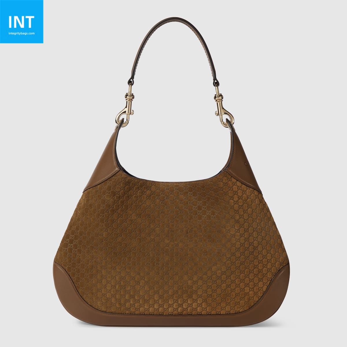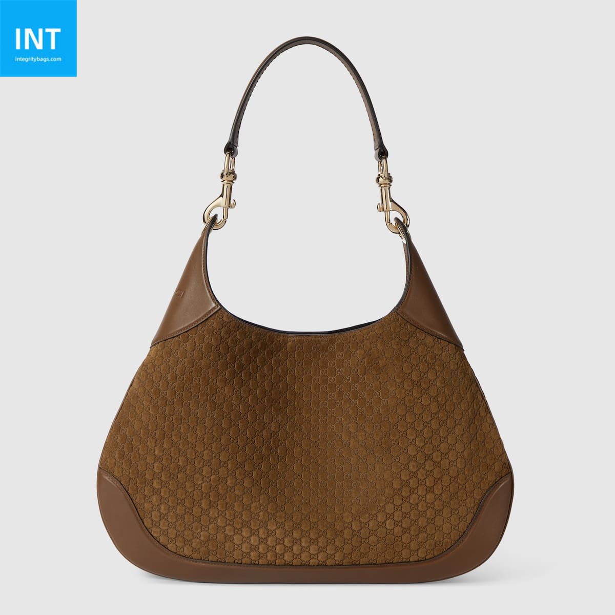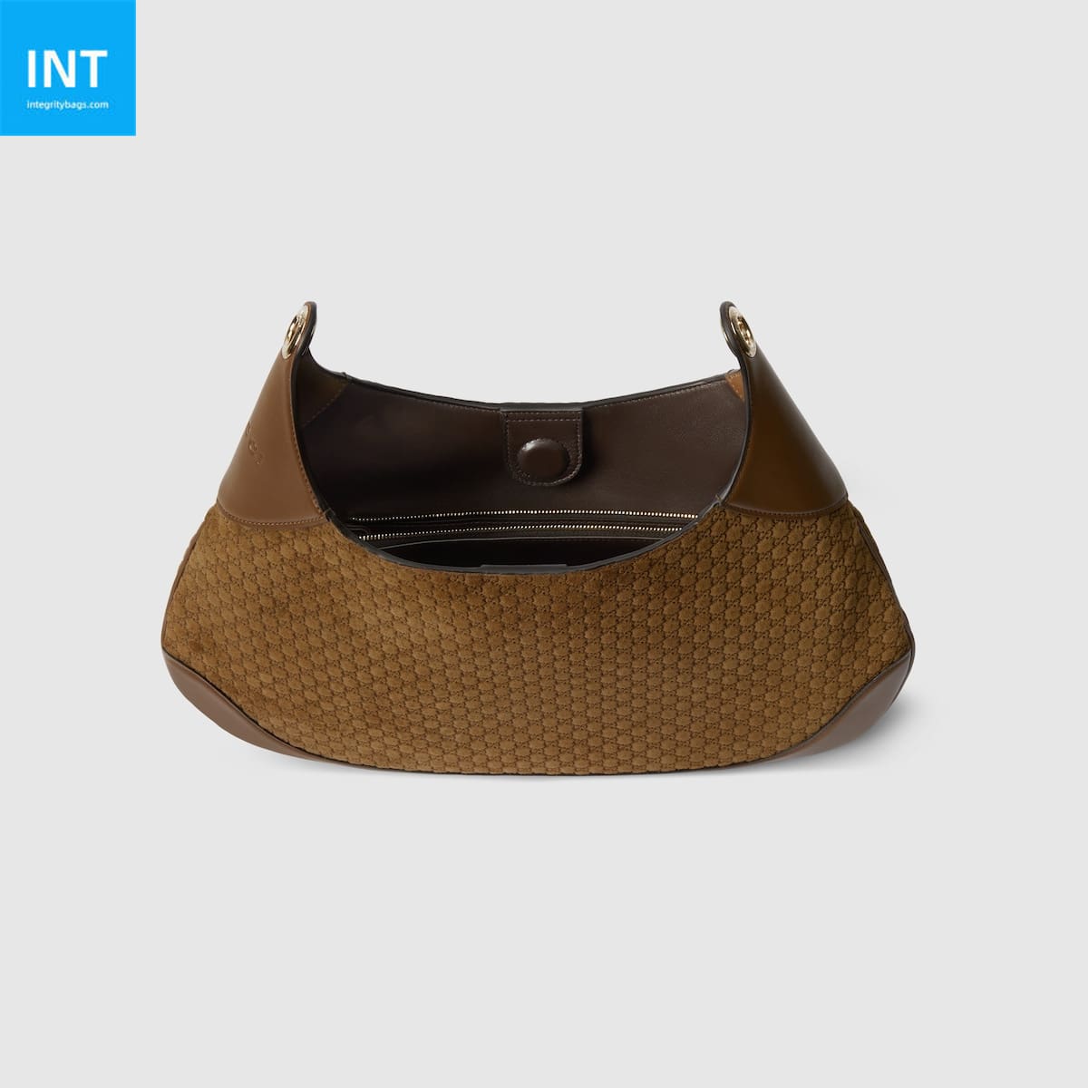 The new Gucci B is inspired by an archival design from the 1950s. Its mid-20th-century origins also inform the essence of this shoulder bag, crafted from soft suede and featuring an additional shoulder strap for crossbody wear.
