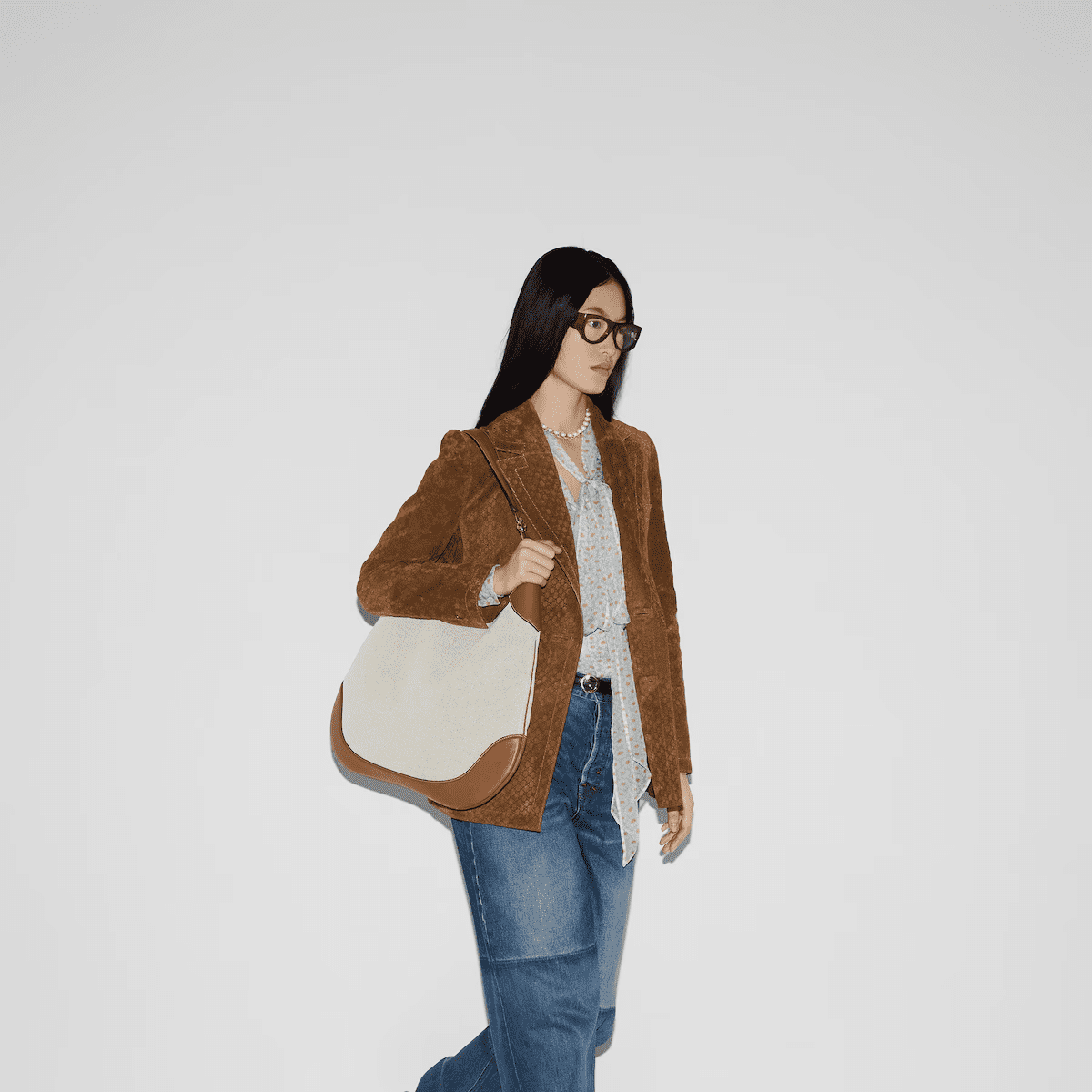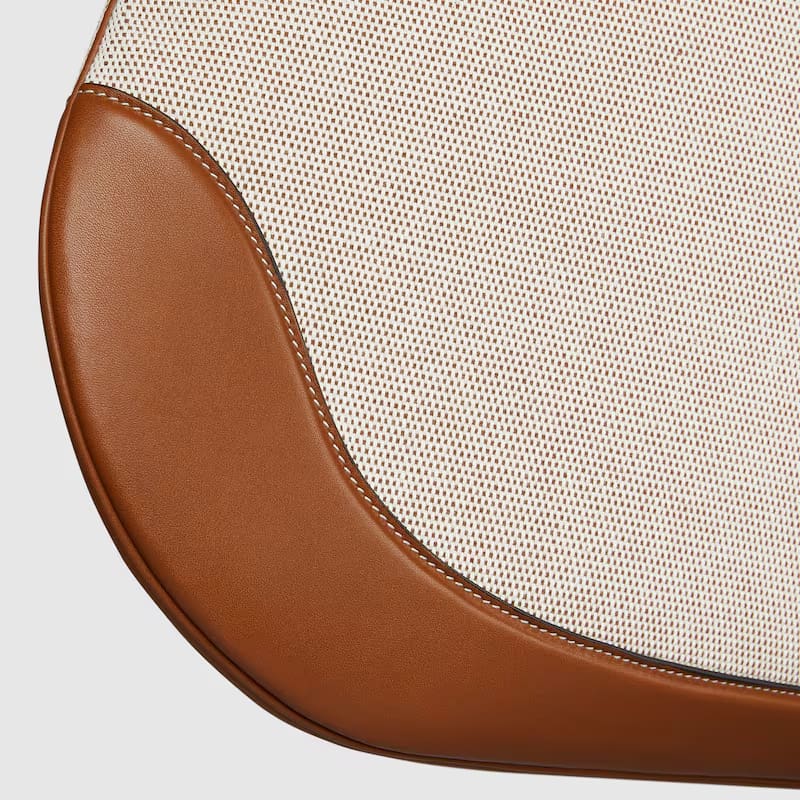 Introducing the Gucci B, which draws inspiration from a 1950s archival style. This medium shoulder bag, embodying the essence of its mid-20th century design origins, is crafted from natural canvas which drapes on the body.