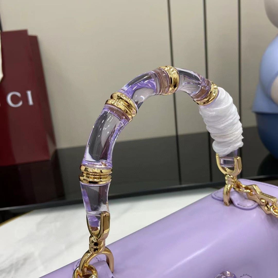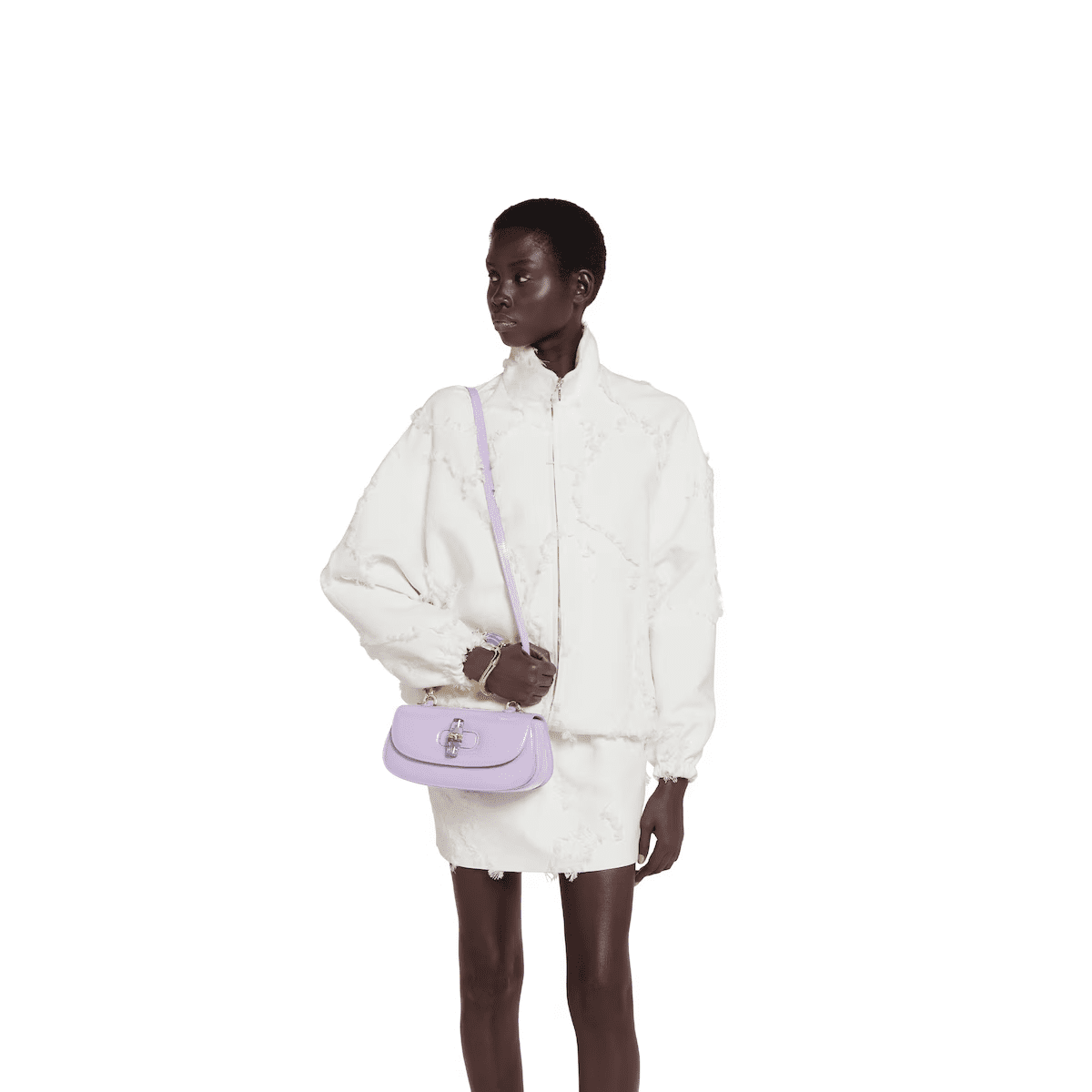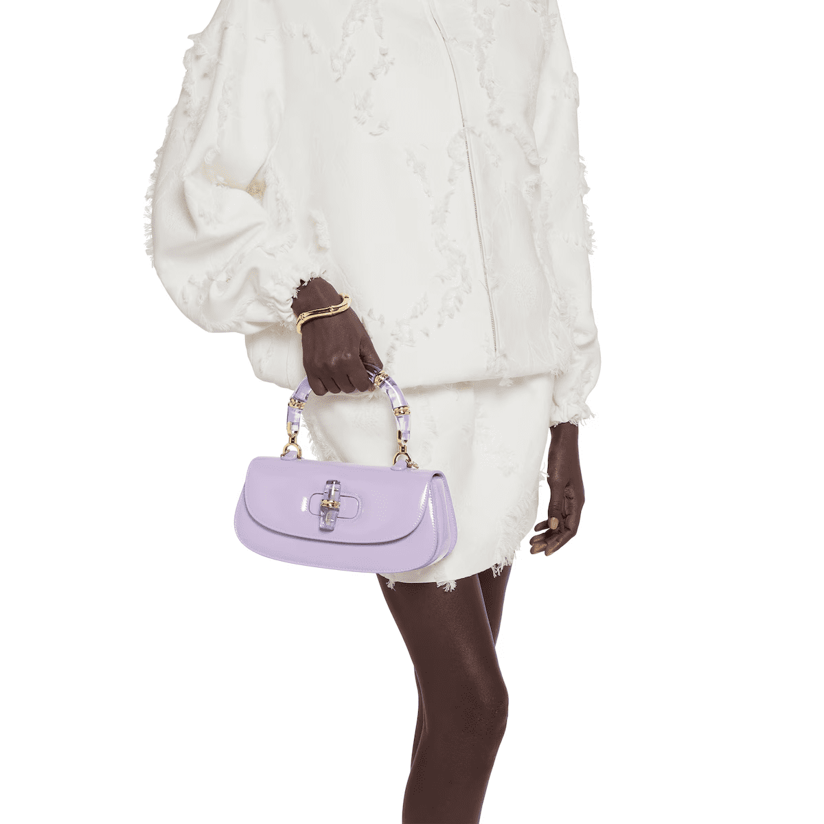 In the Spring Summer 2025 collection, this small top handle bag reinterprets the signature bamboo hardware with resin and brass details. Gucci Bamboo Diva is the starring feature for any look.