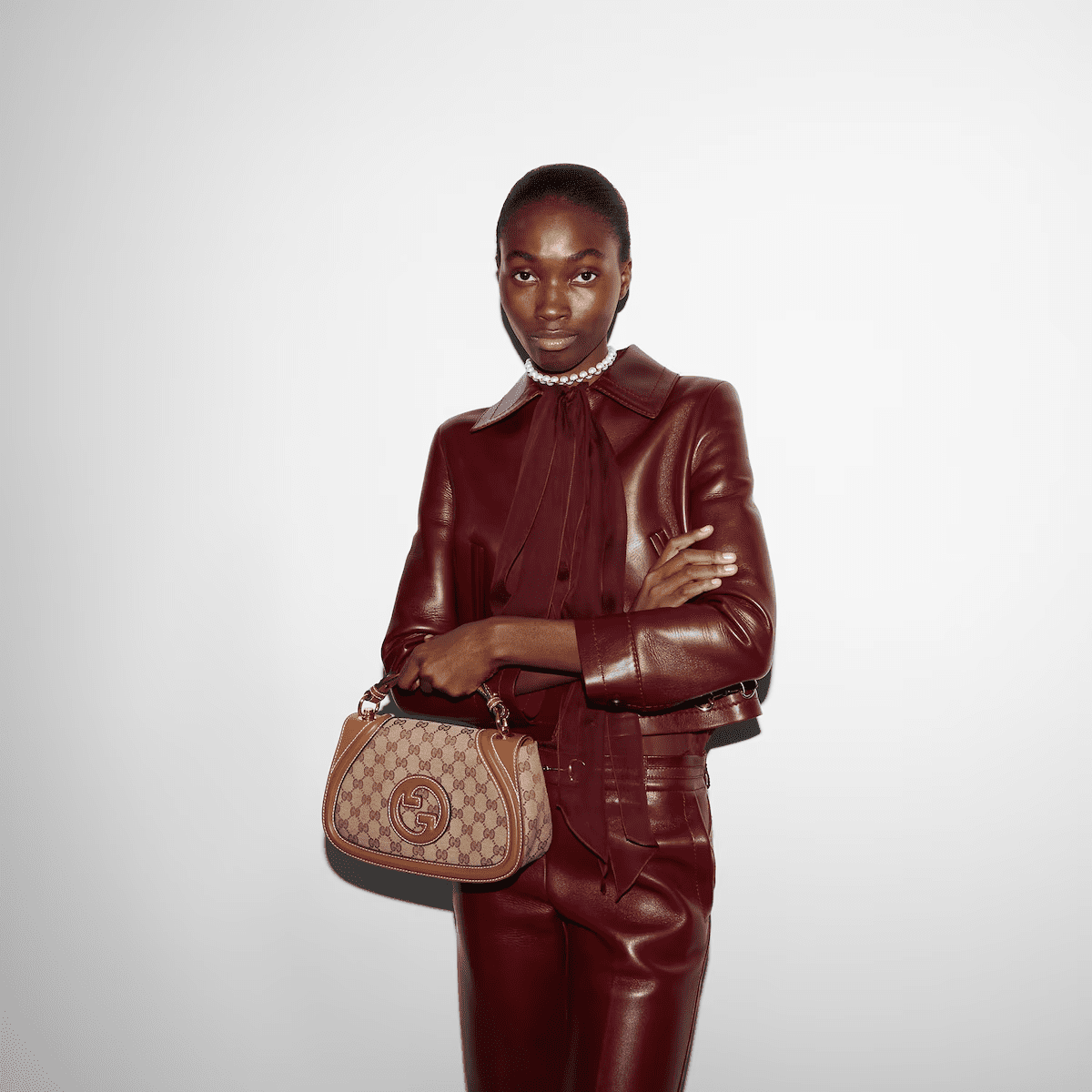 The new Gucci Blondie bag, whose distinctive logo first appeared in the House’s collections in the early 1970s, weaves together past and present in a fusion of nostalgia and modernity. Presented in beige and ebony Original GG canvas with a smooth brown leather trim, this small bag is complete with a top handle and adjustable shoulder strap.