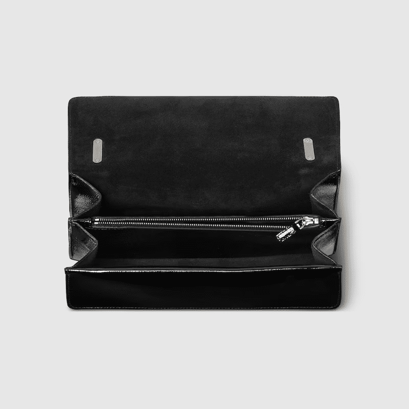 A soft, deconstructed version of the signature Dionysus shoulder bag presents a contemporary look. This style in sleek black patent leather features the iconic tiger head closure with a flap and a sliding chain that can be worn both as a shoulder bag and a top handle bag, giving it many possibilities to wear.