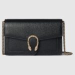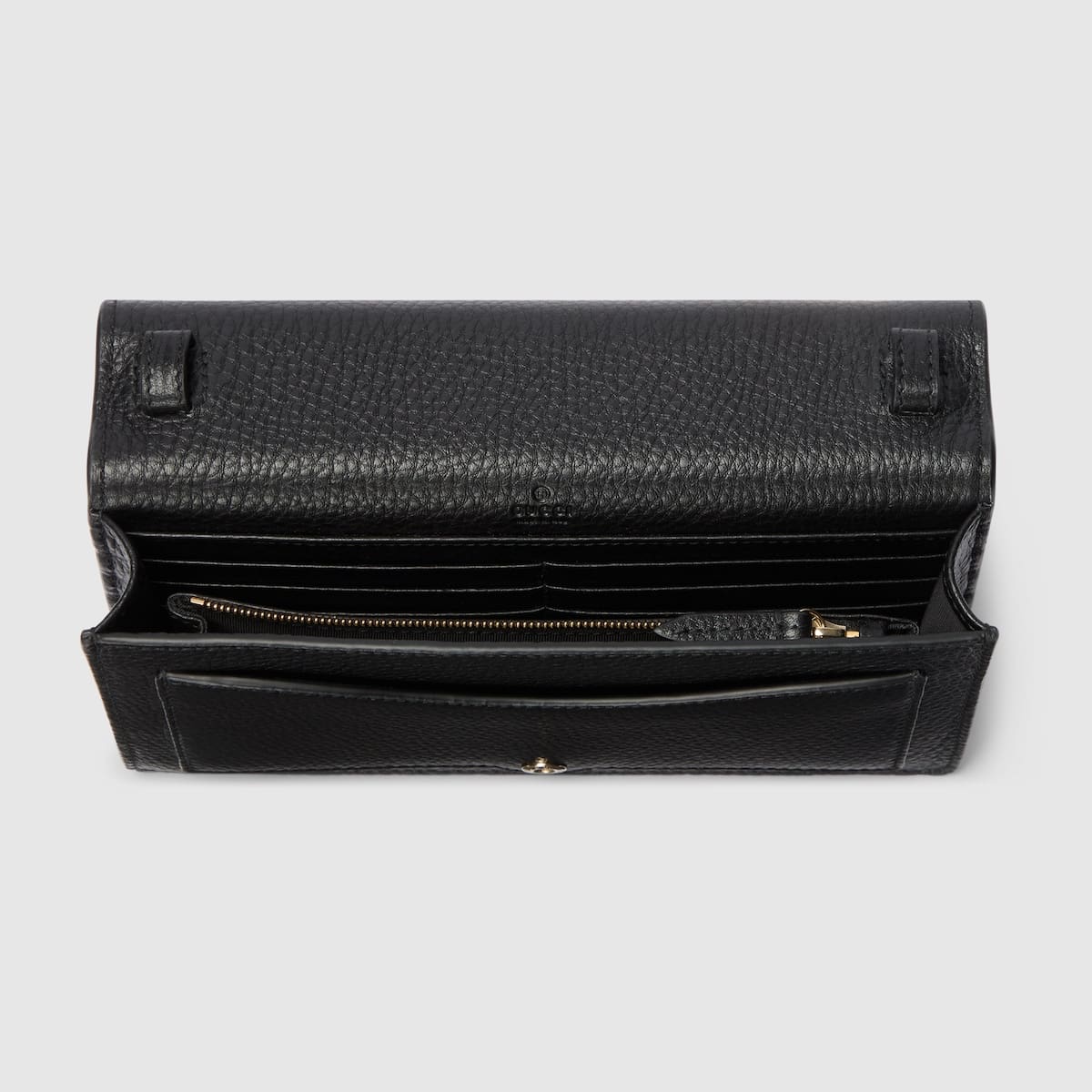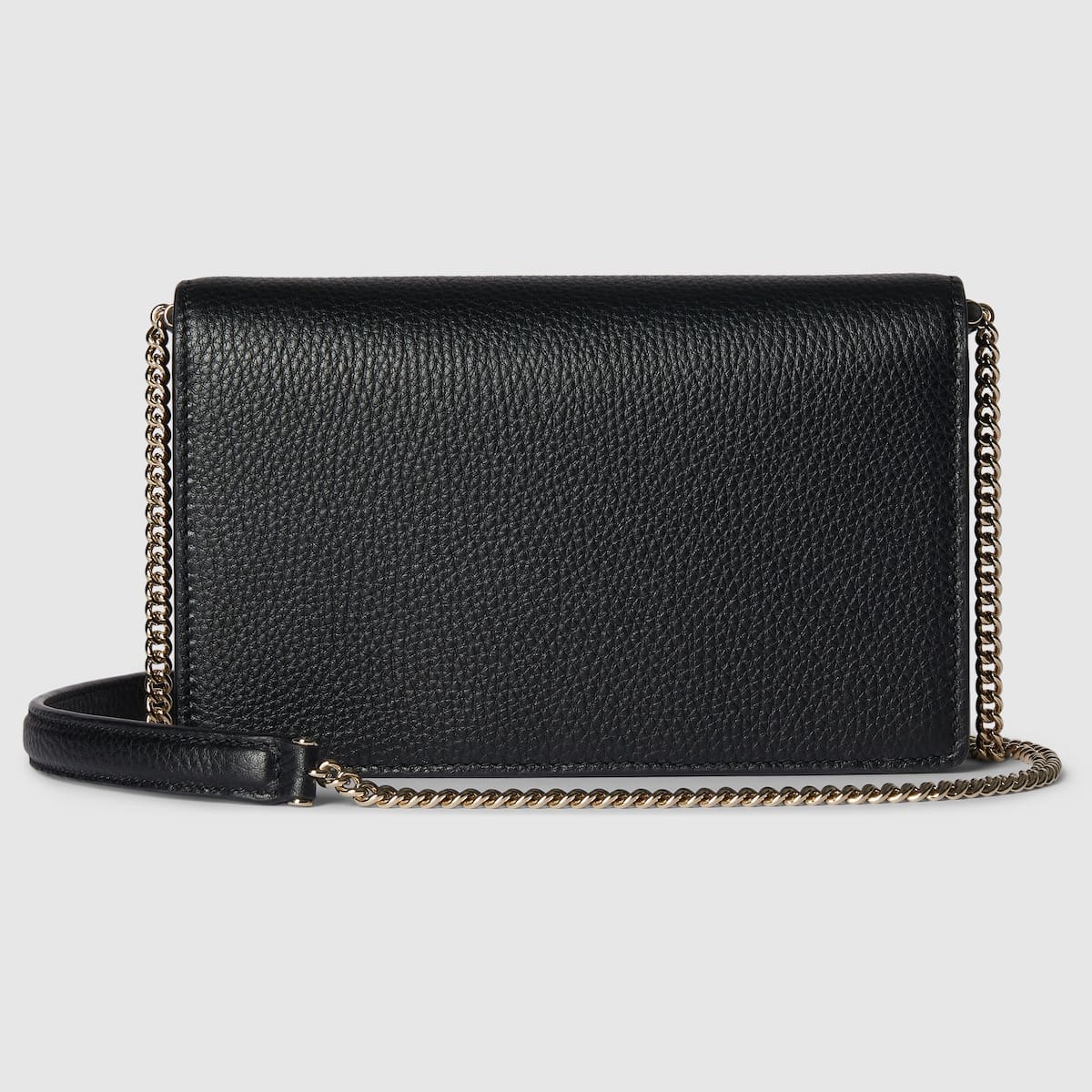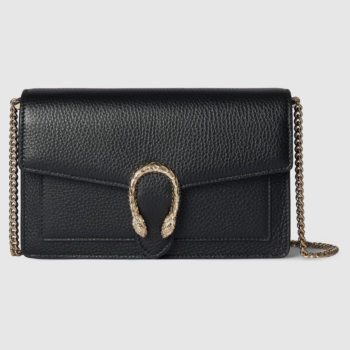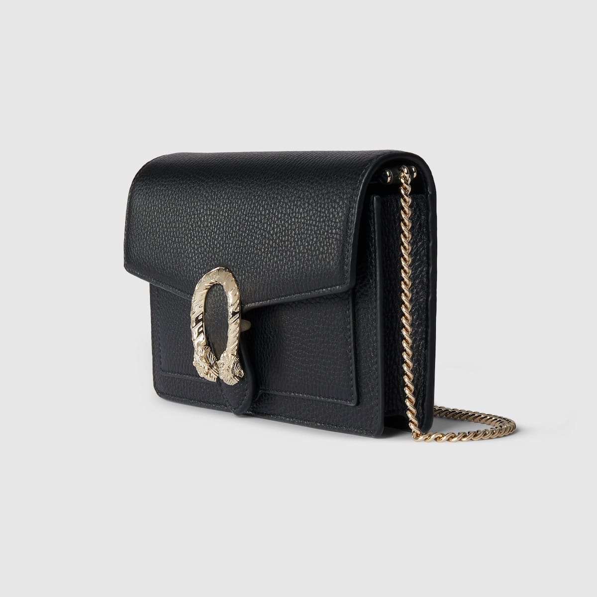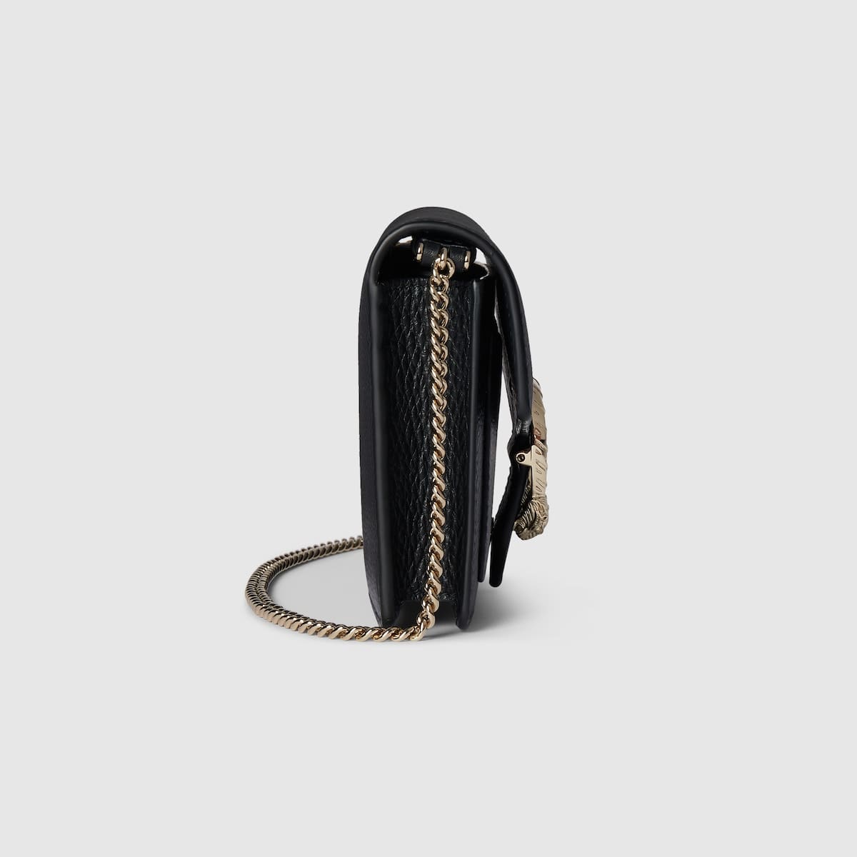 Crafted from black grainy leather, this Dionysus wallet on chain features a tiger head with button closure. Completed with a fixed chain shoulder strap, the design offers a compact yet sophisticated silhouette to carry from day to evening.