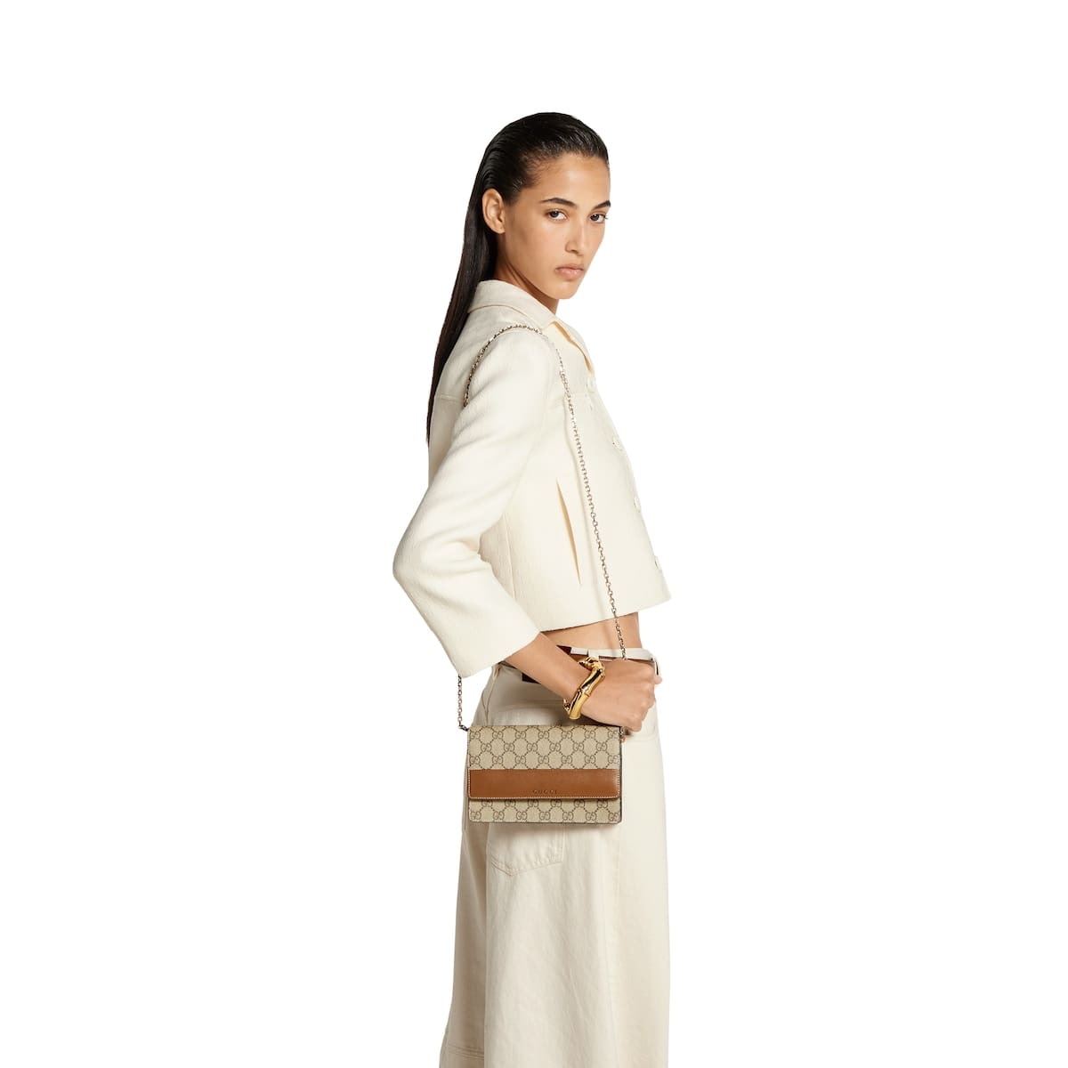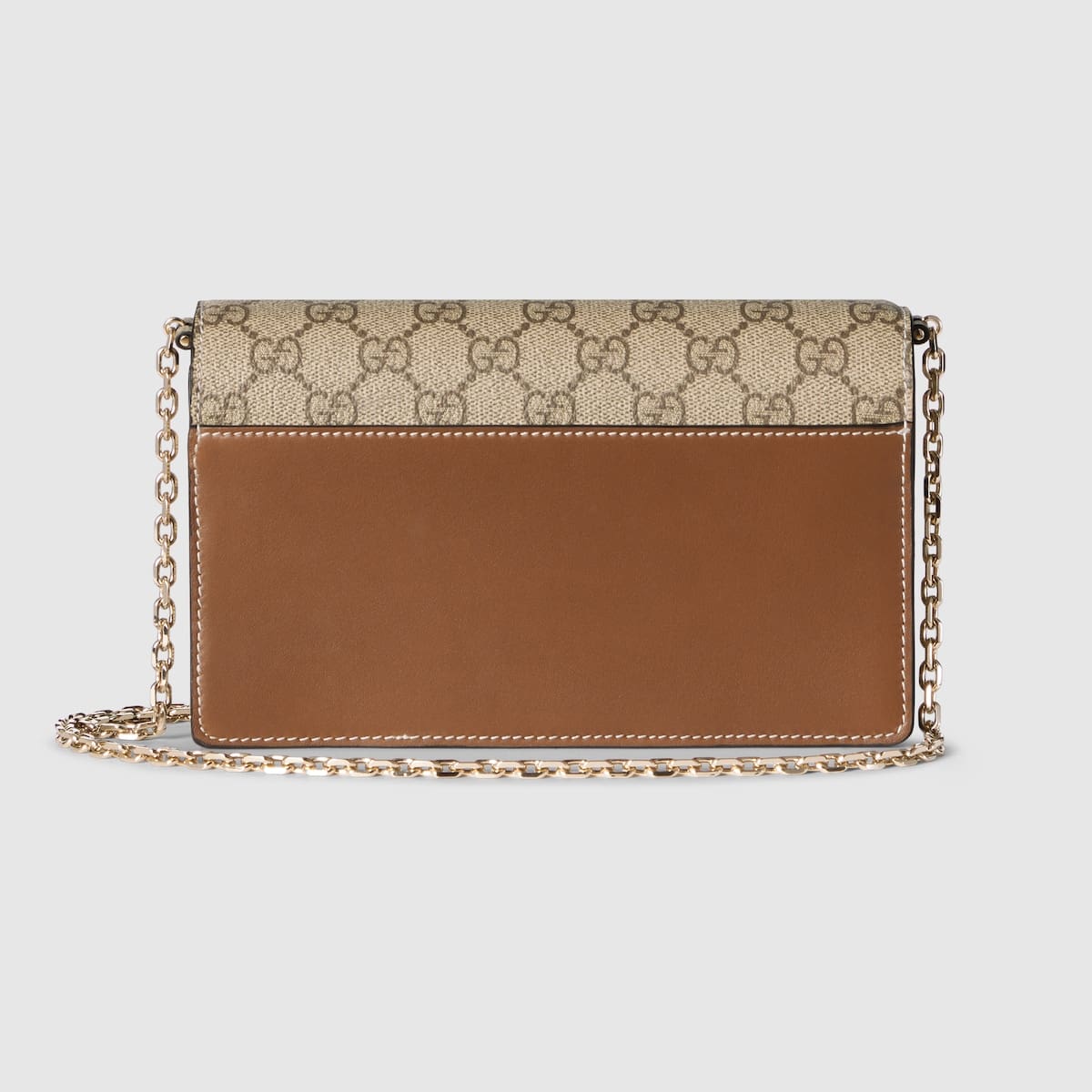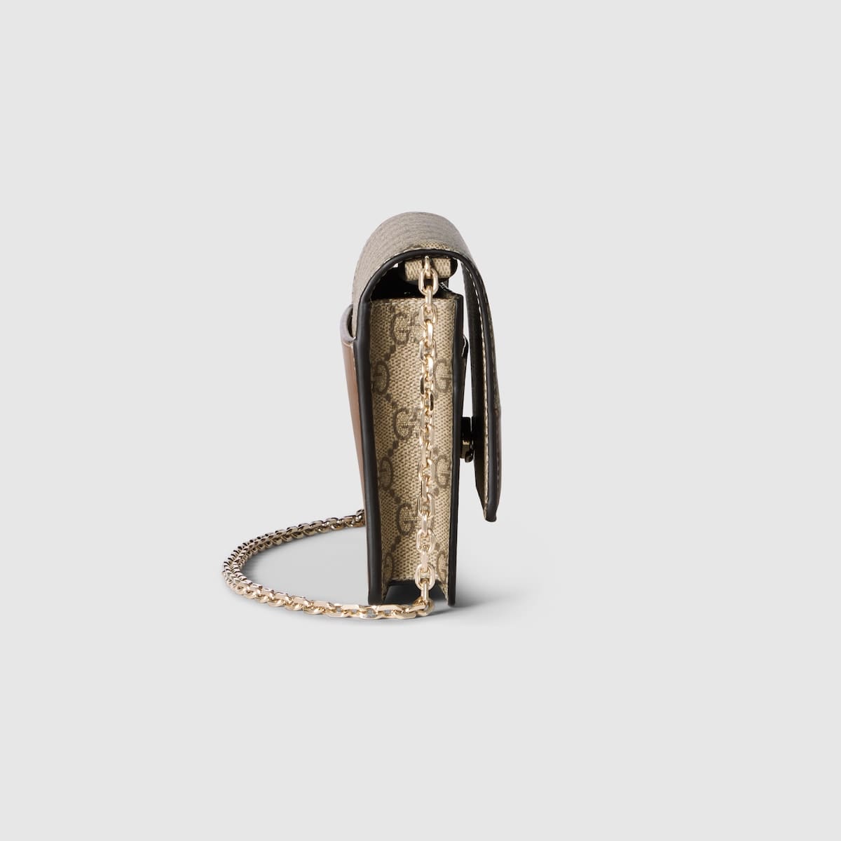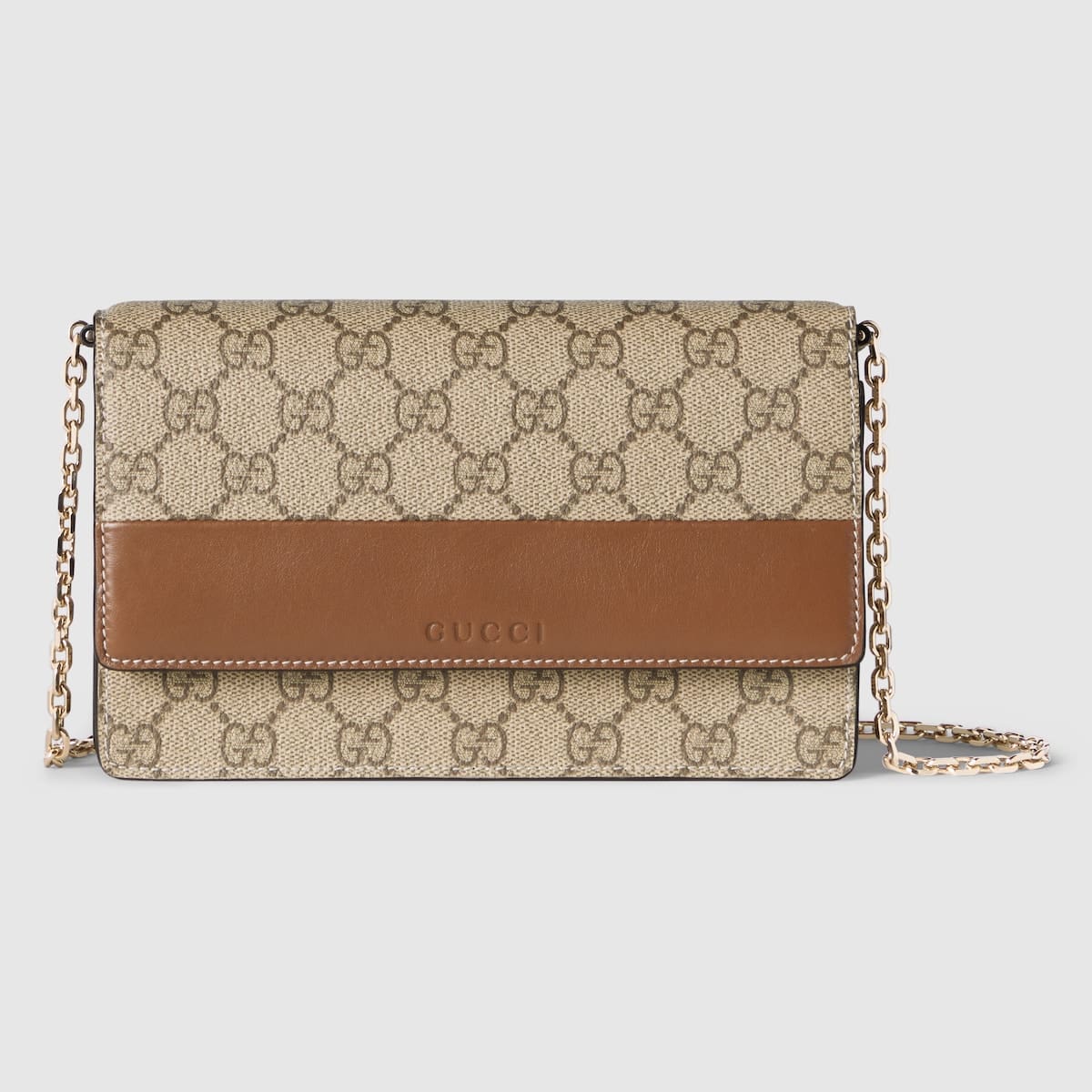 In the Spring Summer 2025 collection, the GG Emblem collection reinterprets the House’s history of elegance and craftsmanship. This wallet on chain is crafted with brown smooth leather and GG Supreme, complete with multiple compartments.