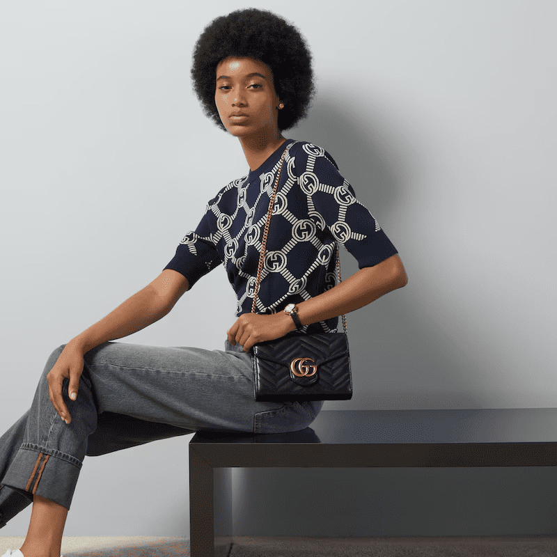 The GG Marmont chain mini bag has a softly structured shape and a flap closure with Double G hardware. The hardware is inspired by an archival design from the ’70s. Made in matelassé chevron leather.