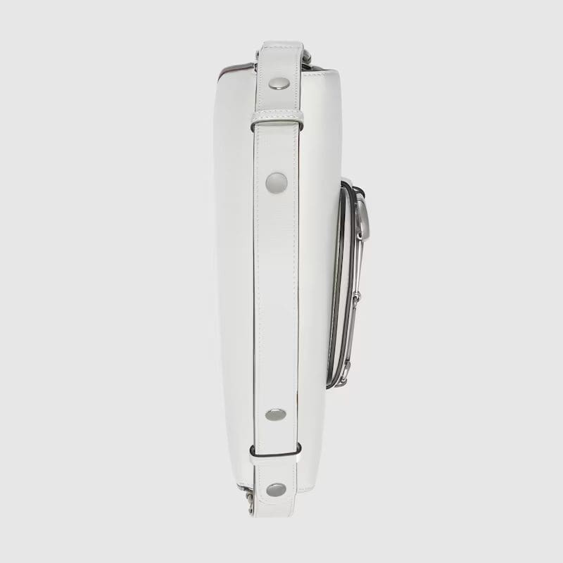 As the historic Horsebit hardware celebrates its 70th anniversary, the House looks at new ways of combining archival features with contemporary silhouettes. Introduced as part of the latest Cruise 2024 collection, this white leather Gucci Horsebit 1955 handbag is defined by an asymmetrical shape that lends a modern feel to the renowned line.