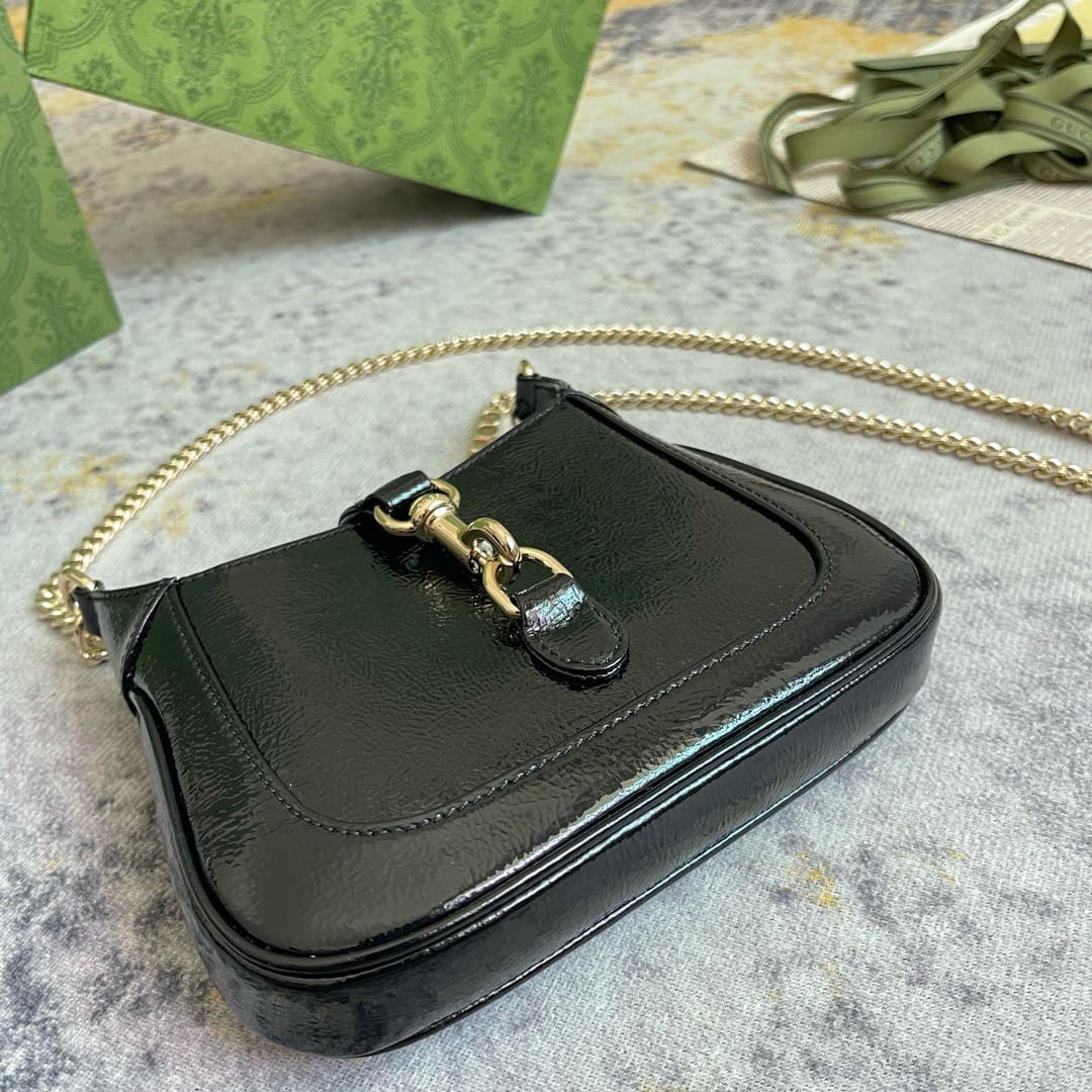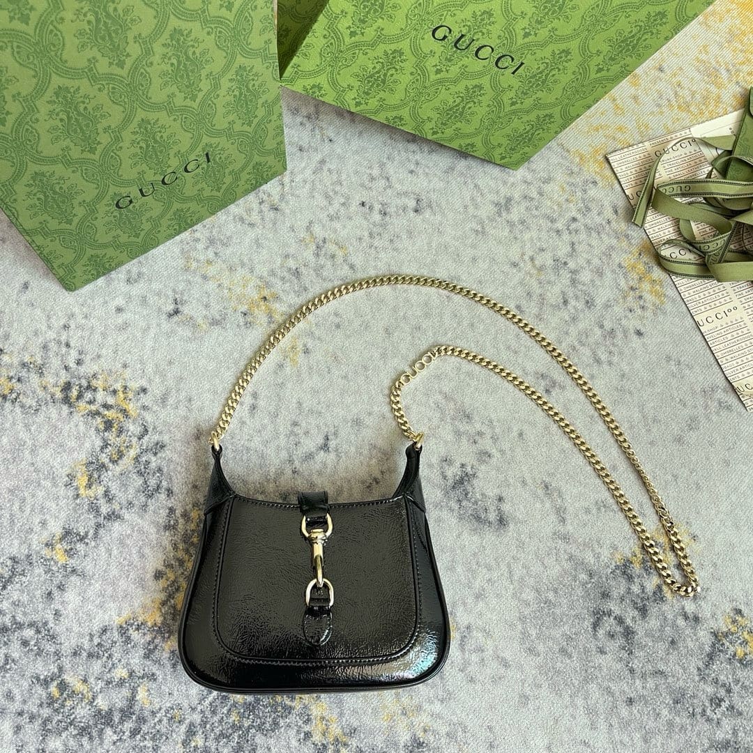 This new Jackie Notte bag was designed by Sabato De Sarno, the brand’s creative director. It vividly reflects the confident heritage of the brand’s classic Jackie series, carefully blending new silhouettes and exquisite details, making it the ideal accessory for evening looks. Black patent leather, hook closure and light gold Gucci lettering chain strap give this mini shoulder bag a unique and fashionable feel.