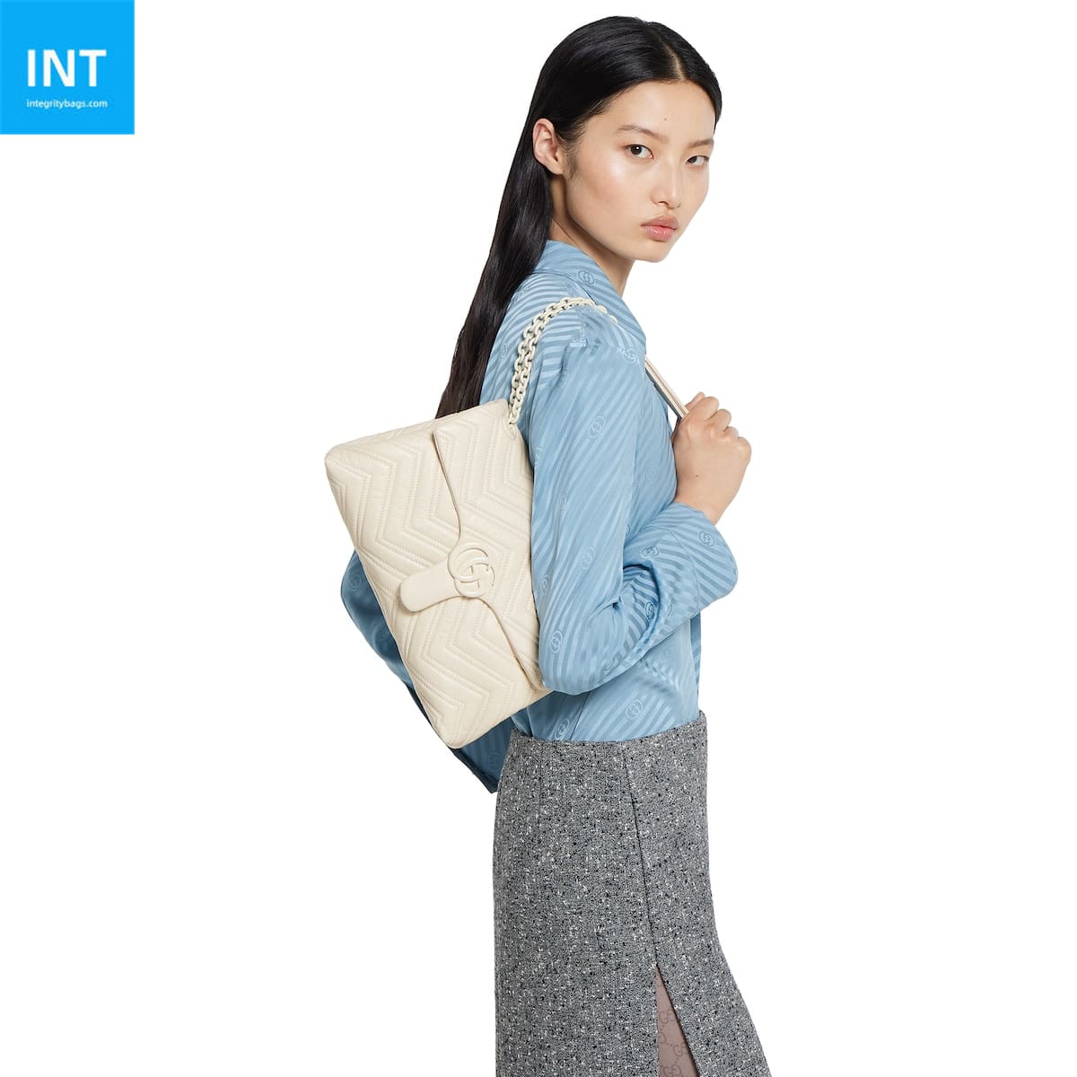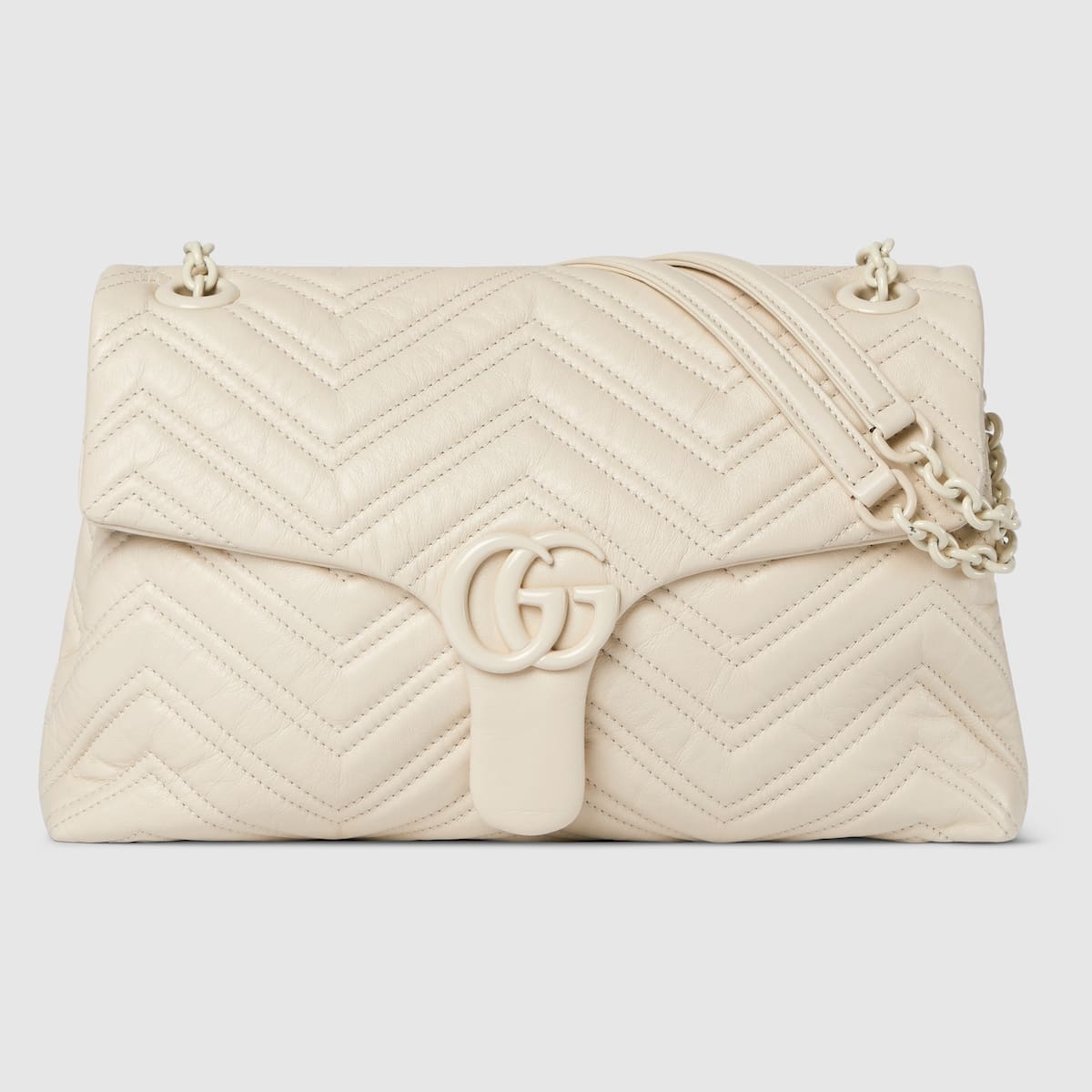 In the Fall Winter 2025 collection, the GG Marmont, a signature collection of the House, features the emblematic Double G, a faceted chain strap, and a soft, structured silhouette. This style is crafted from soft lightweight matelassé chevron leather and comes with a tonal enameled hardware and chain.