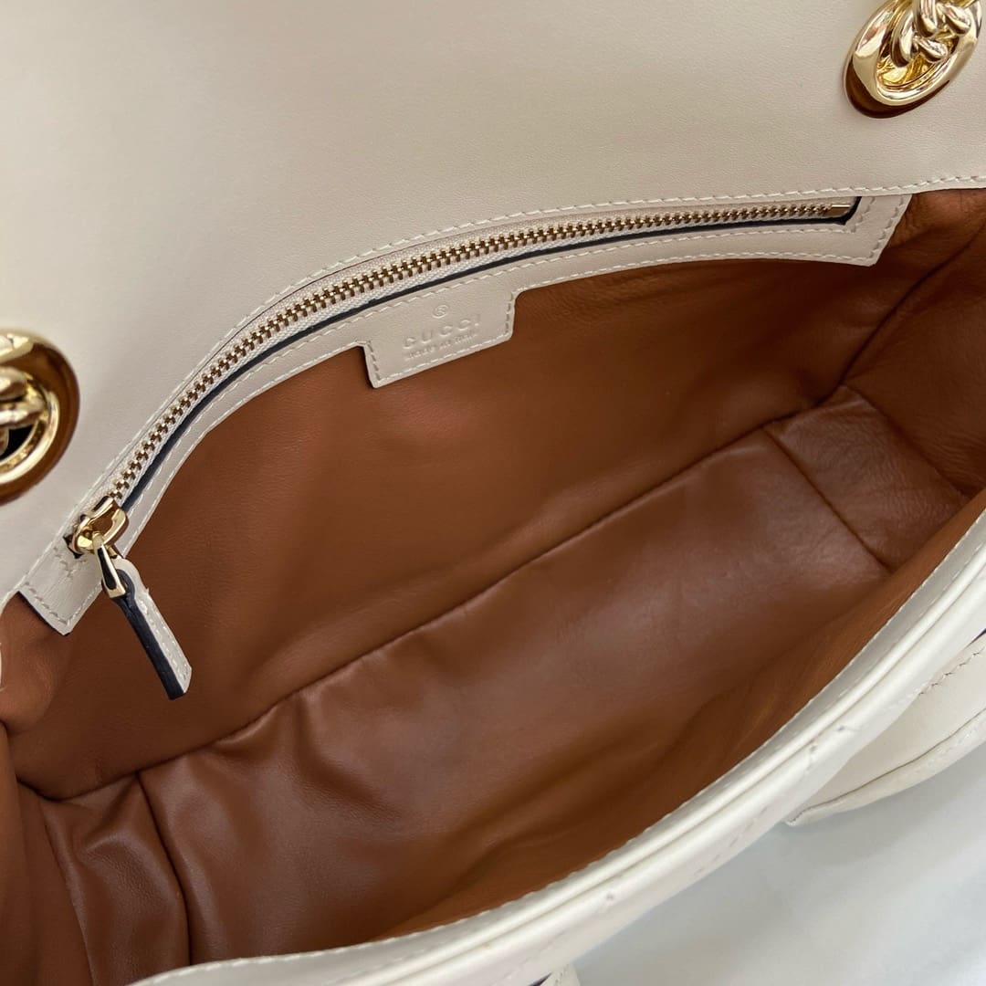 The GG Marmont line has always combined innovative material and design, and for Pre-Fall, multiple zip pockets placed on the outside further emphasize the geometry and sophistication of the matelassé chevron leather. Brown leather lining, light gold toned hardware, and an adjustable leather and chain shoulder strap completes this small shoulder bag.