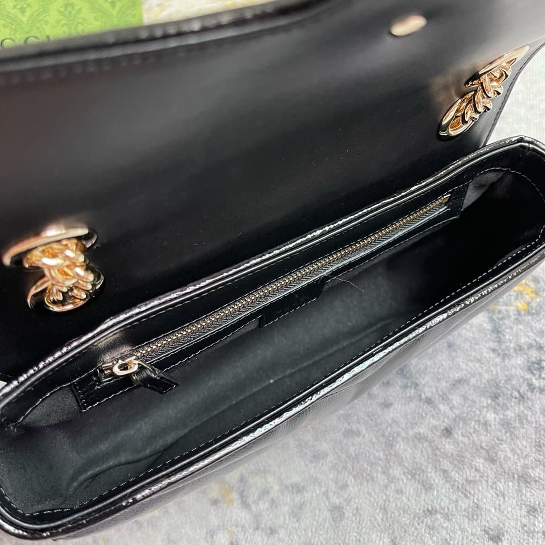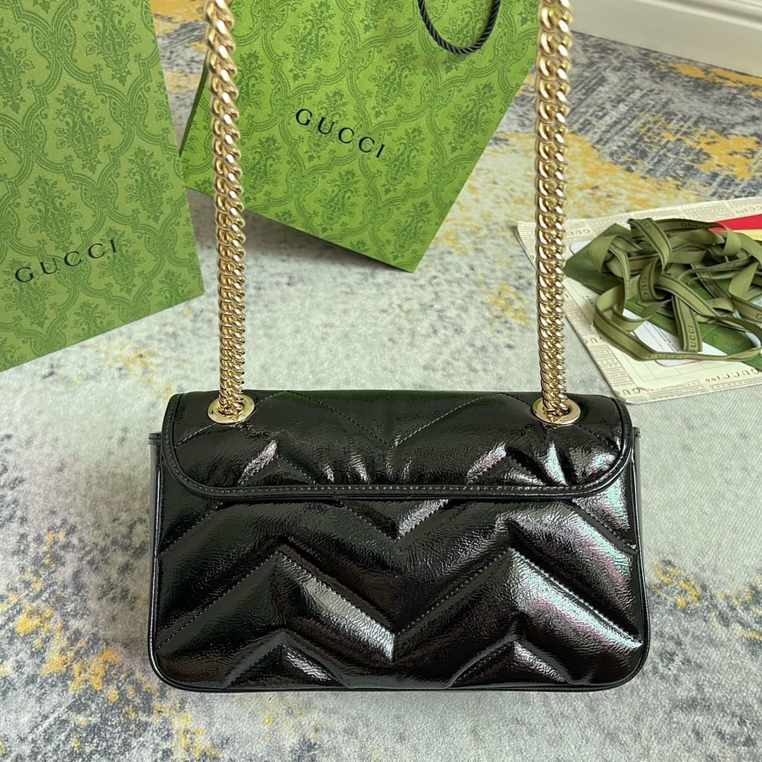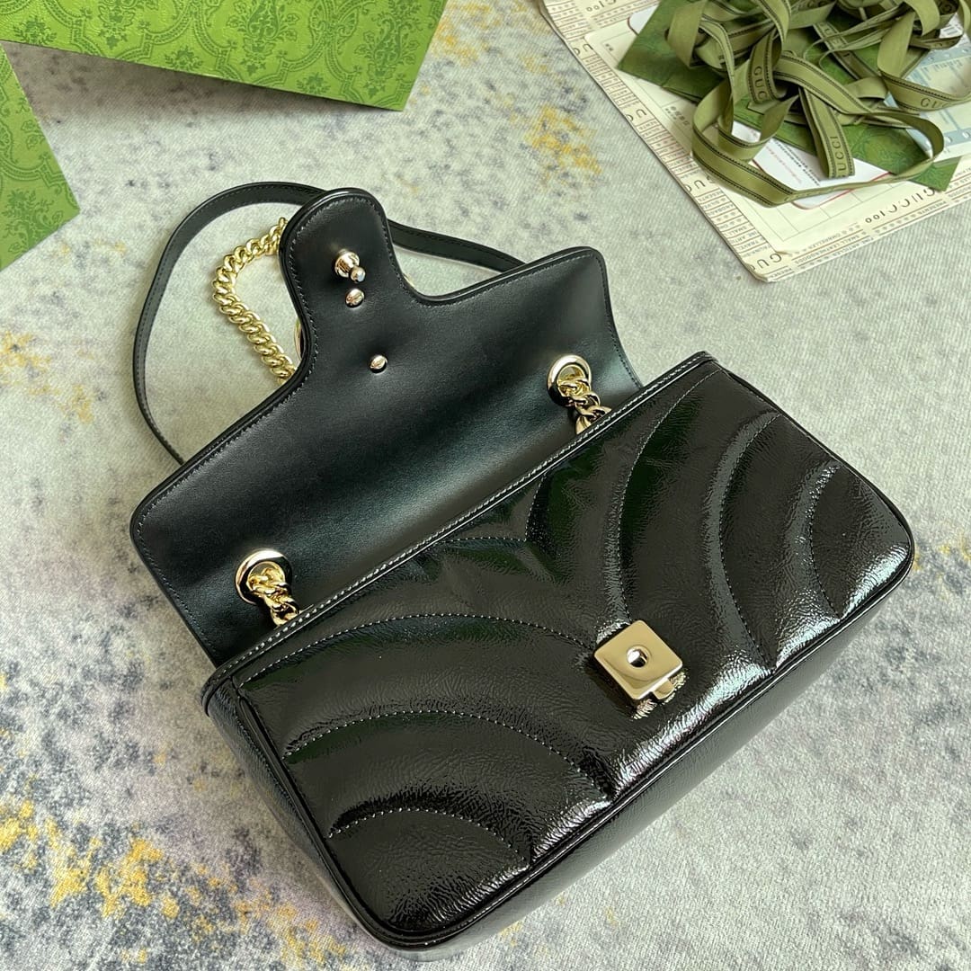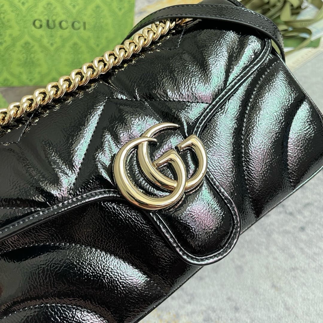 The GG Marmont collection spotlights sophisticated leather in dark tones to welcome Pre-Fall. Crafted in quilted chevron patent leather, this small shoulder bag underlines its contemporary silhouette in black, complete with light gold toned hardware.