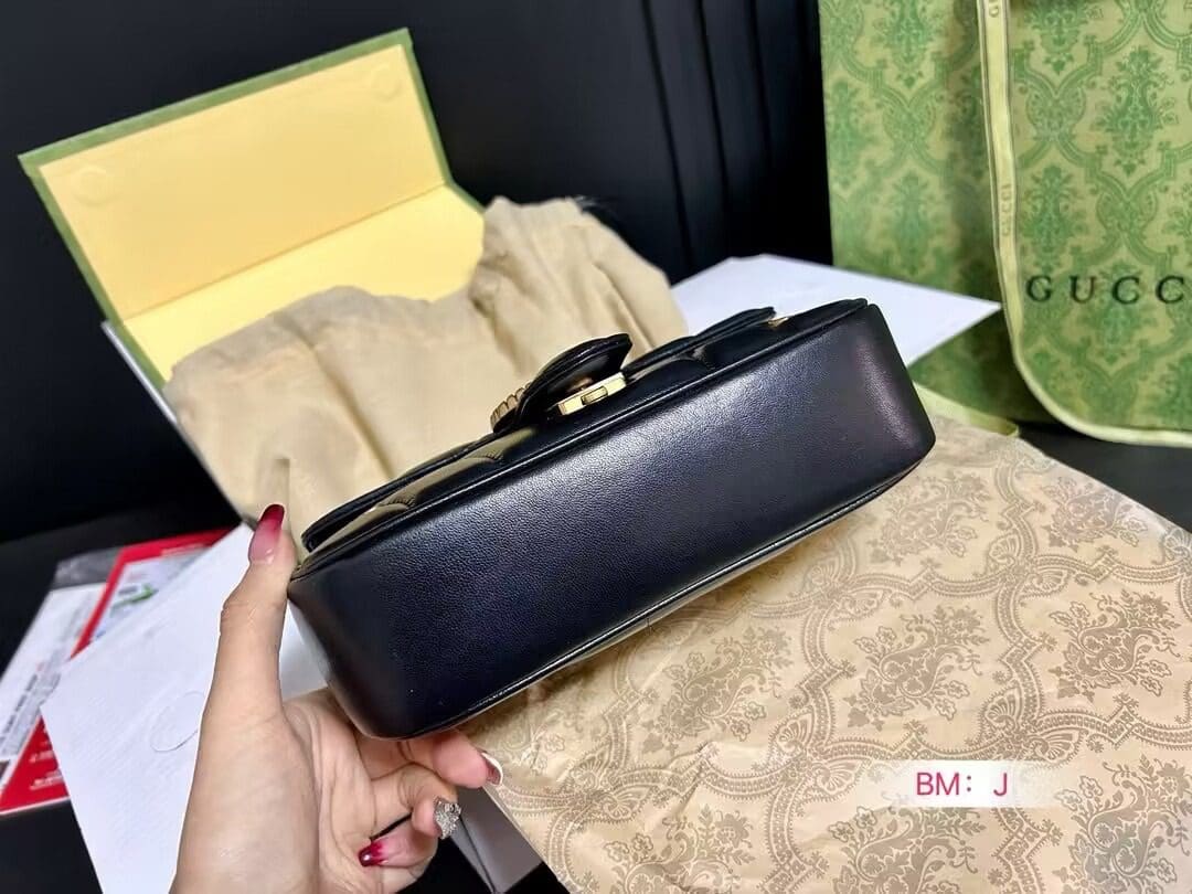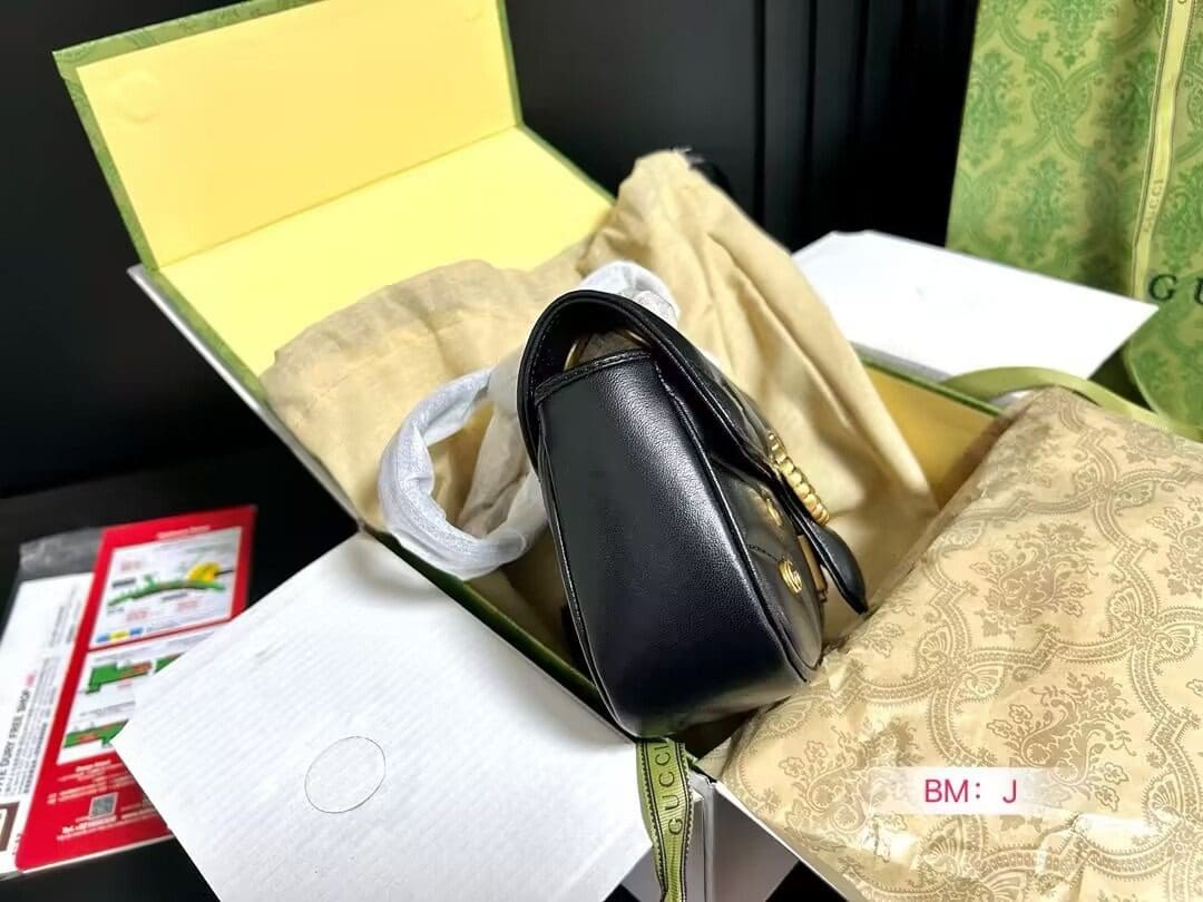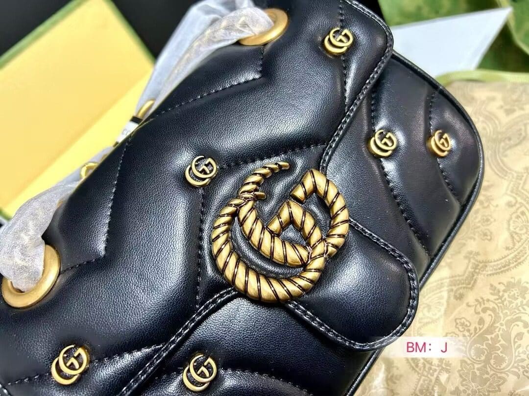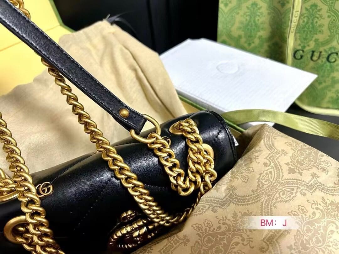The GG Marmont shoulder bag presents a softly padded version of the black GG Matelassé leather with small Double G studs, and a twisted torchon Double G embellishment. The sliding chain strap smoothly transforms from a single shoulder length to a doubled top handle length for multiple ways to wear the bag.