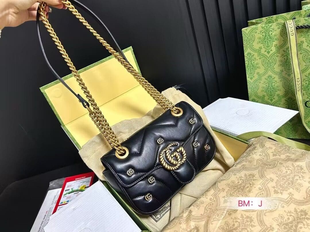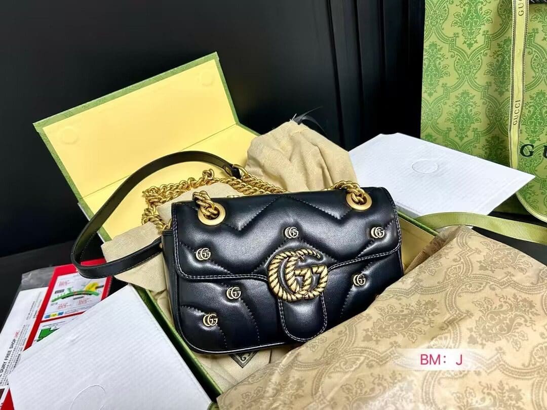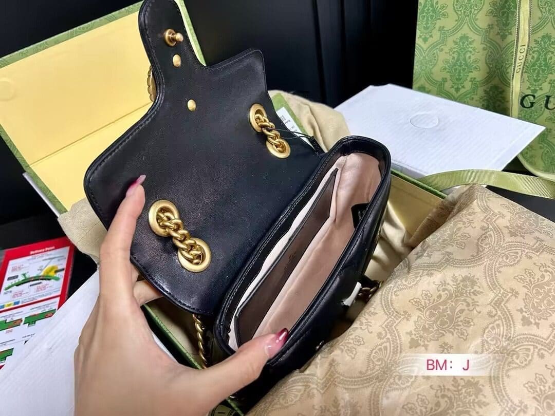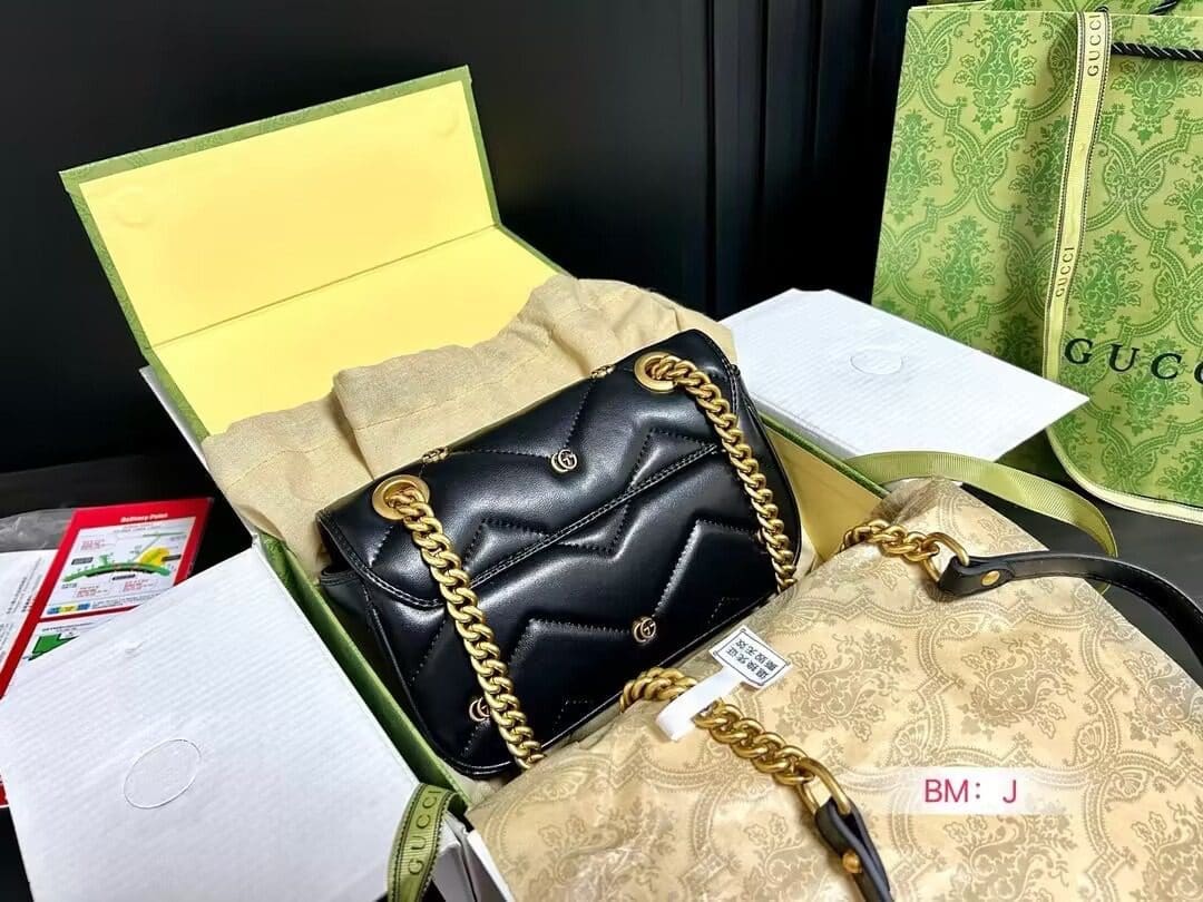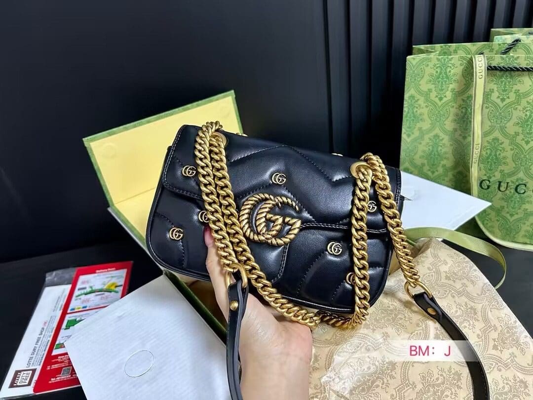 The GG Marmont shoulder bag presents a softly padded version of the black GG Matelassé leather with small Double G studs, and a twisted torchon Double G embellishment. The sliding chain strap smoothly transforms from a single shoulder length to a doubled top handle length for multiple ways to wear the bag.