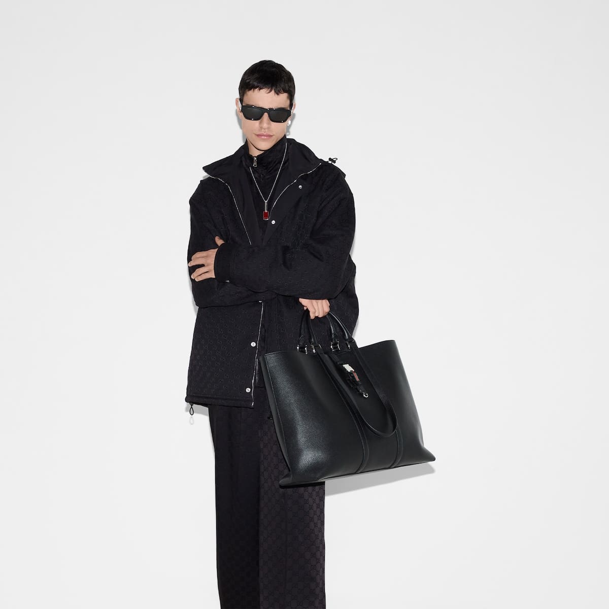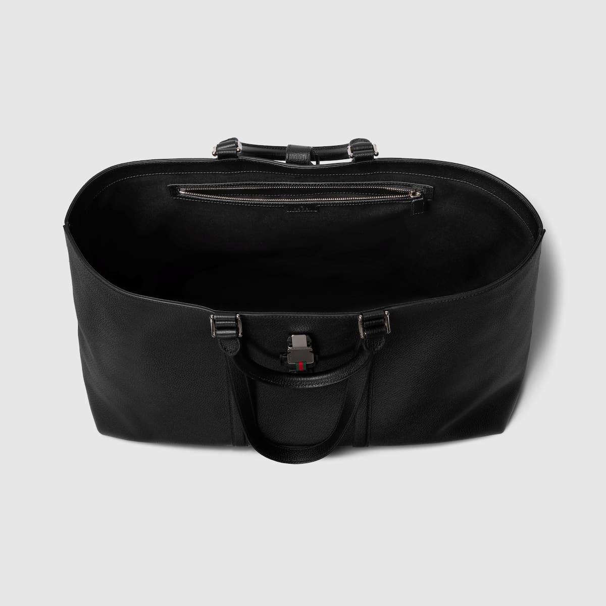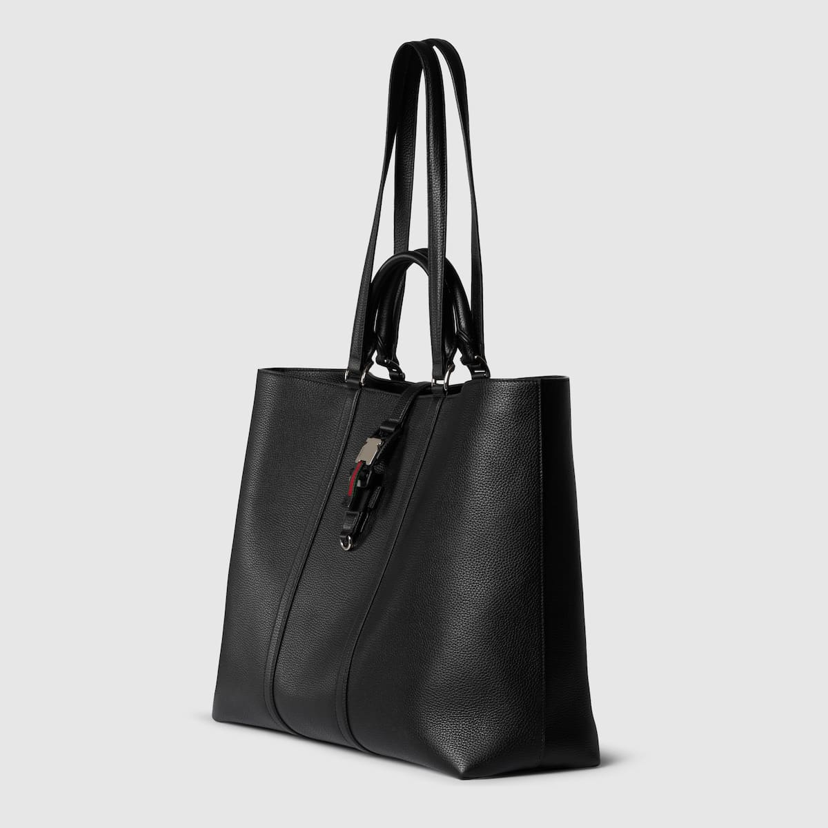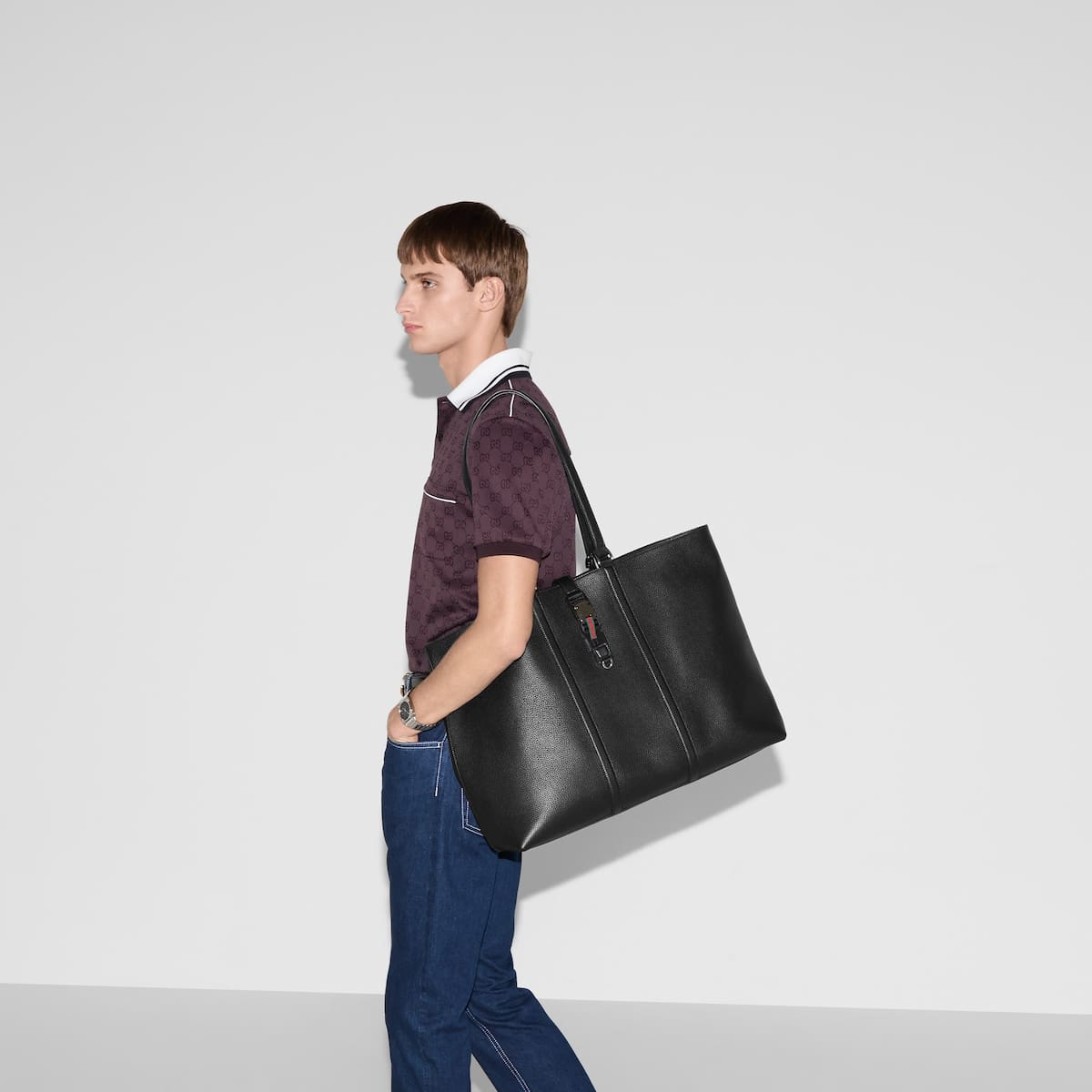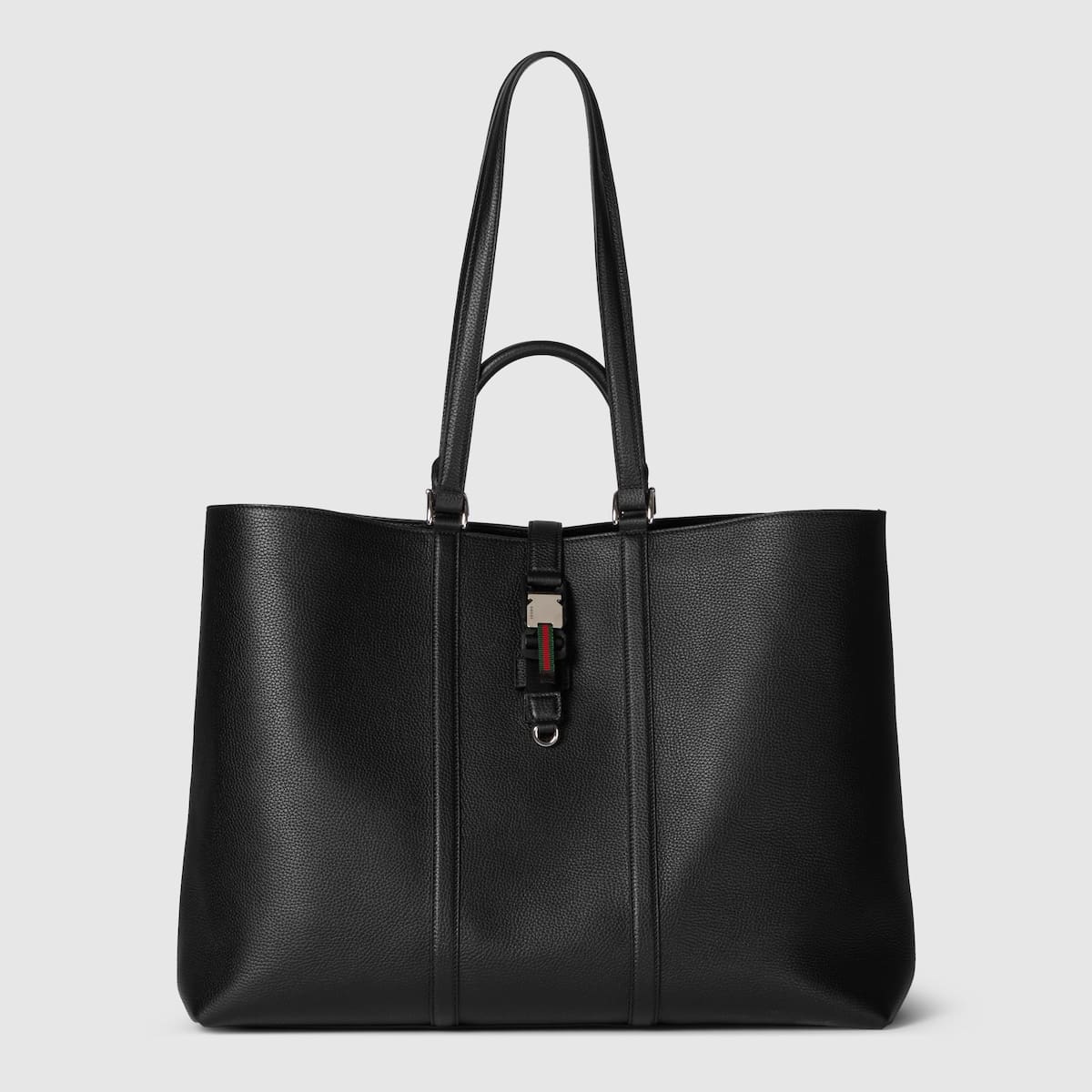 This tote bag is crafted from a soft grainy leather that lends a supple quality to the silhouette. Contemporary design details, such as magnetic metal closure and Web loop detail, make this everyday accessory a desirable companion.