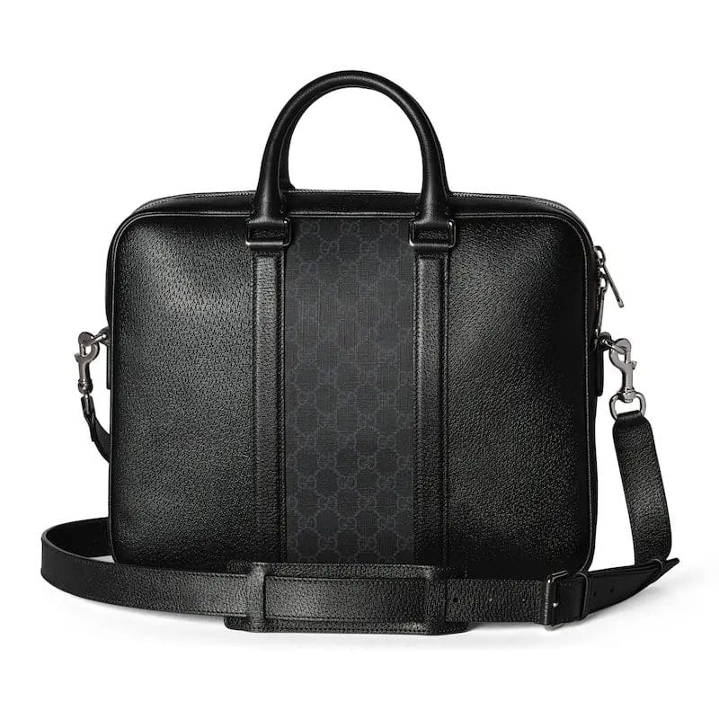 Selected bags such as the mini crossbody, briefcase and tote are updated with practical details. This briefcase is crafted from black leather and GG Supreme canvas and features a laptop compartment and an adjustable shoulder strap. The leather “Gucci Made in Italy” label adds an elegant touch of brand identity to the design.