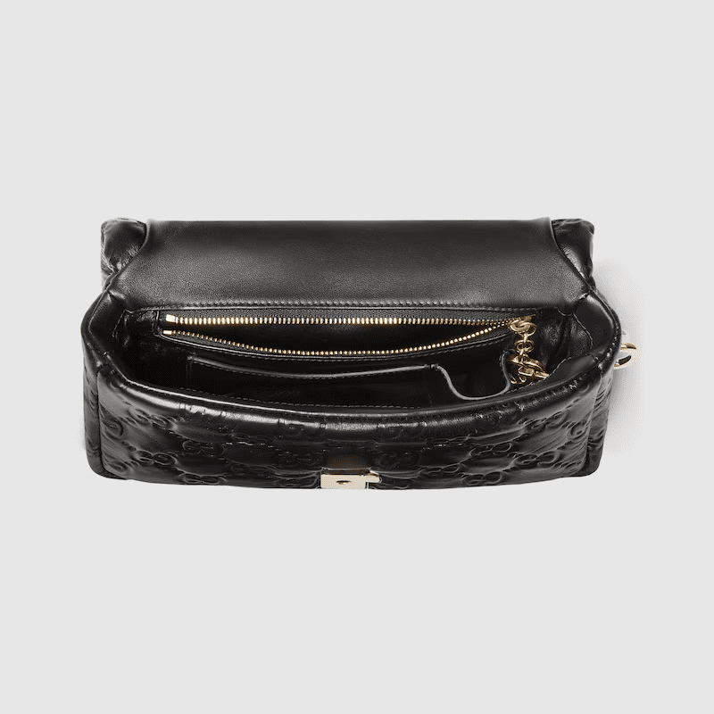 • One zip pocket with GG charm, one open pocket and one lipstick storage compartment