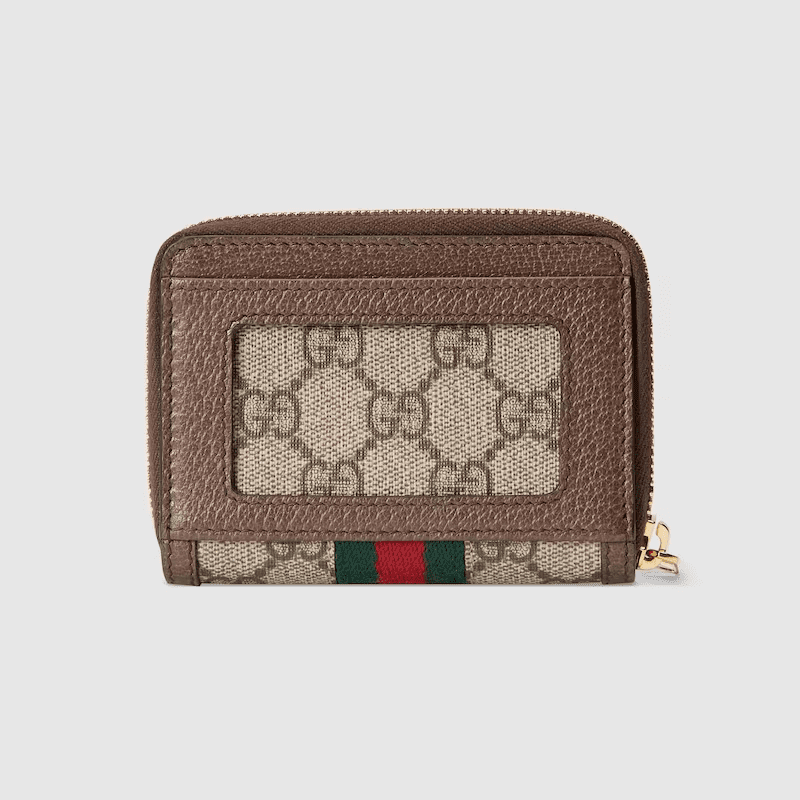 The world of Ophidia is enriched by the introduction of a petite card case that can also be used as a wallet. Crafted from the House’s monogram canvas, the style’s logo appeal is deepened by the green and red Web stripe and the Double G—archival details that celebrate Gucci’s history.