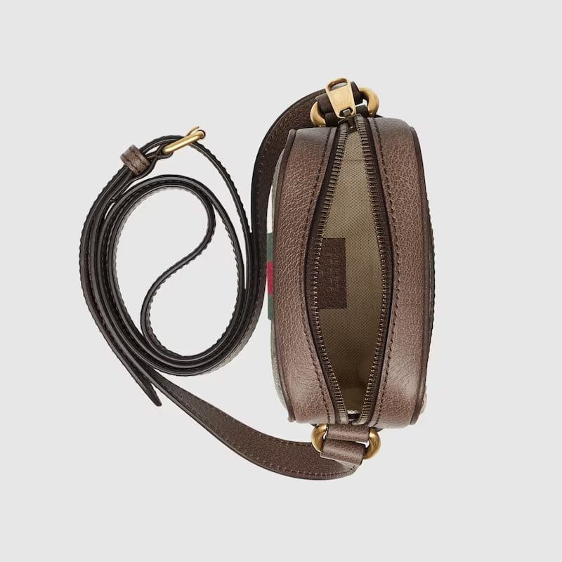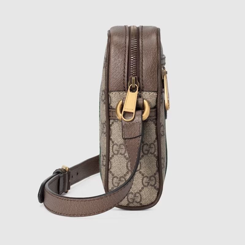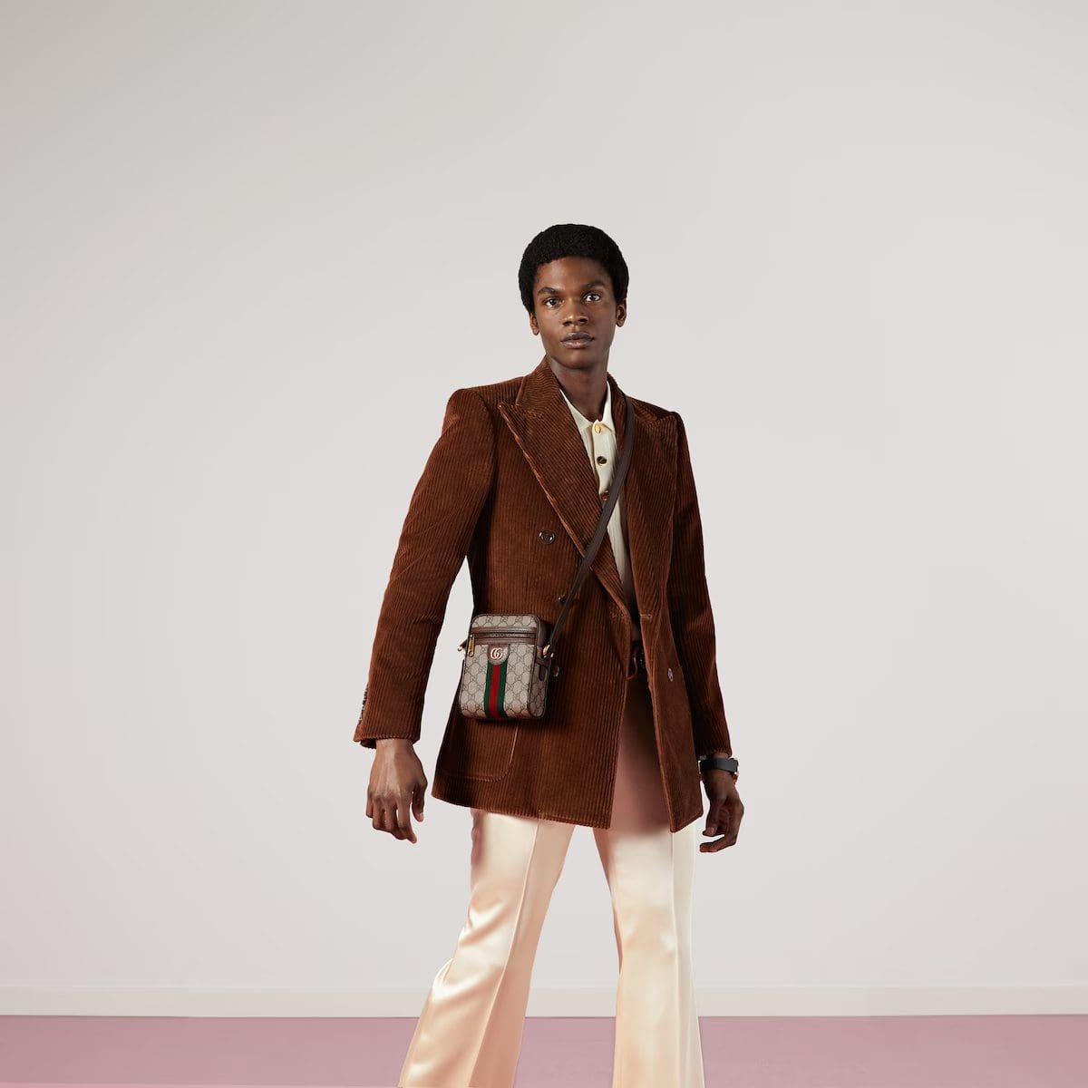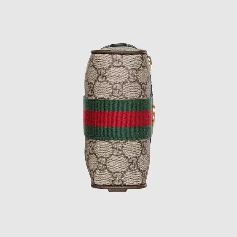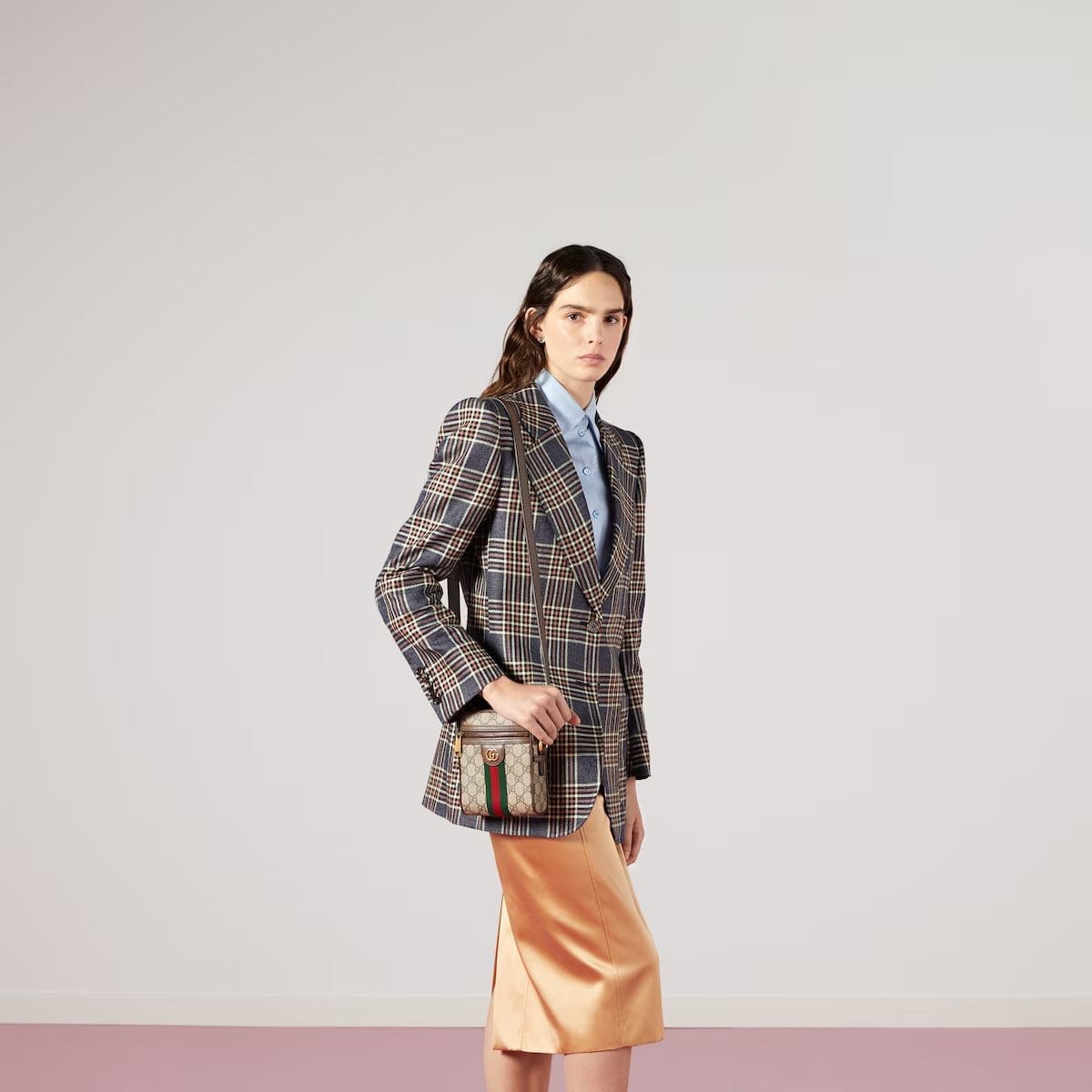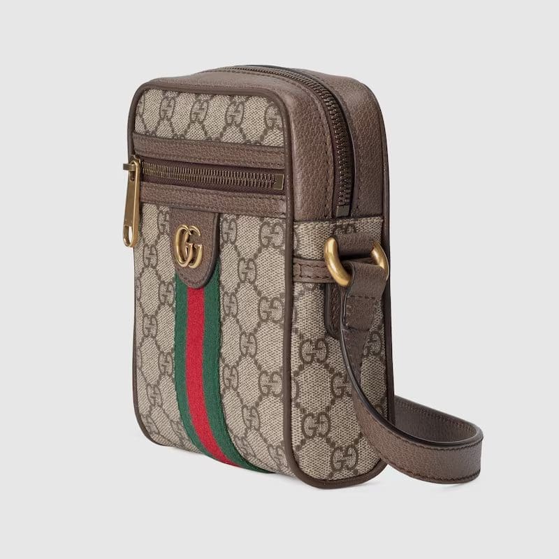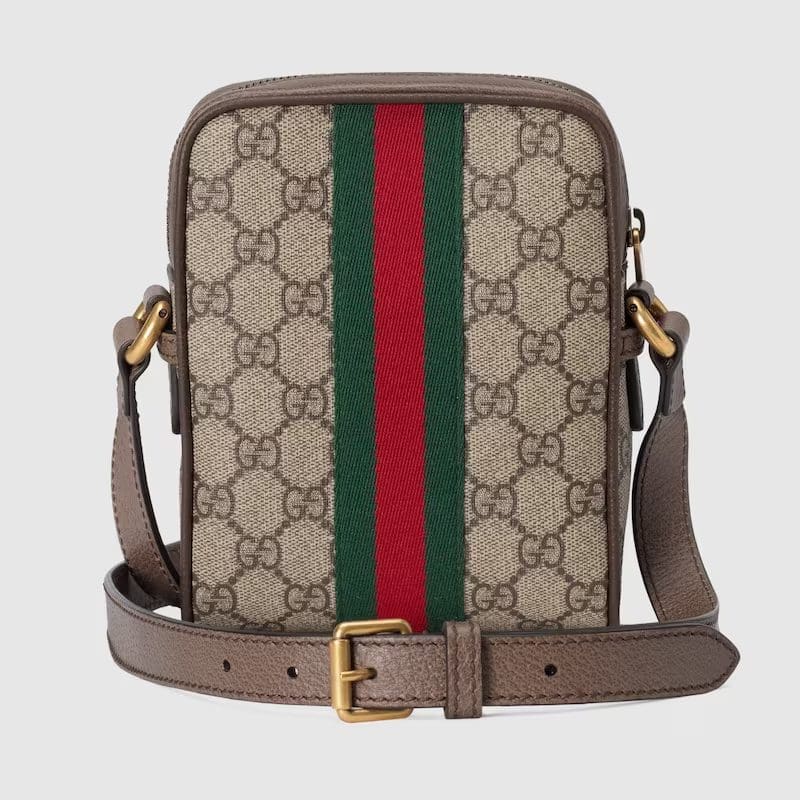The shoulder bag has a small elongated shape with a zipper closure and front pocket. A classic combination of the House’s most recognisable elements—the GG motif and Web stripe—the world of Ophidia continues to evolve, incorporating new shapes and silhouettes. Crafted in GG Supreme canvas, the collection is defined by the Double G hardware.