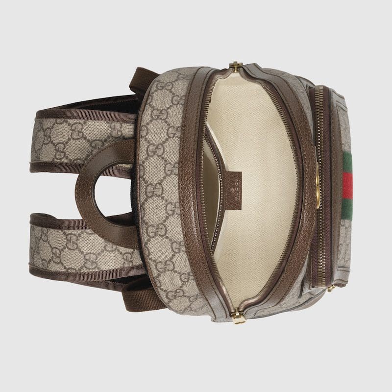 A versatile style that can be used as a travel accessory or a bookbag, the backpack continues to be an important silhouette in the world of Gucci, offered in a variety of sizes and interpretations. Part of the ever-expanding world of Ophidia, it’s crafted in GG Supreme canvas with textured leather trim. The inlaid green and red Web detail and Double G hardware are steeped in the House’s rich history, referencing symbols incorporated in Gucci collections since the ’50s.
