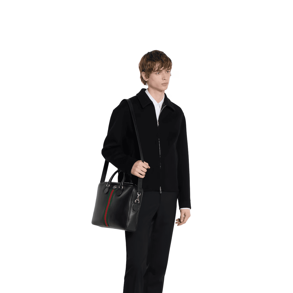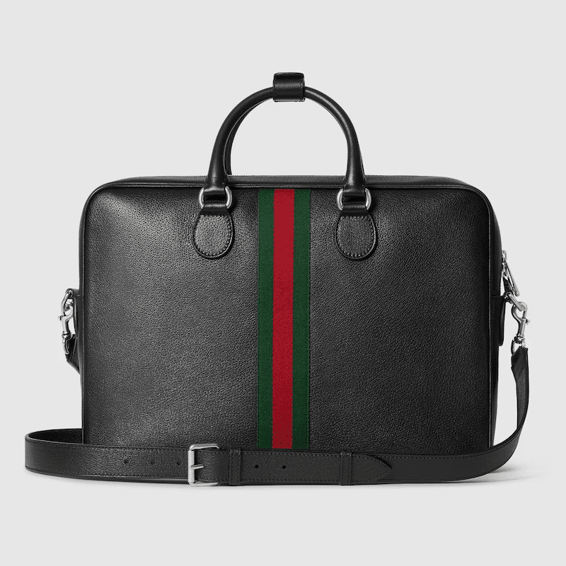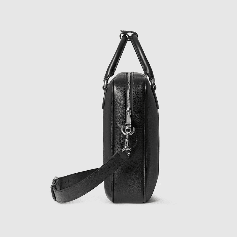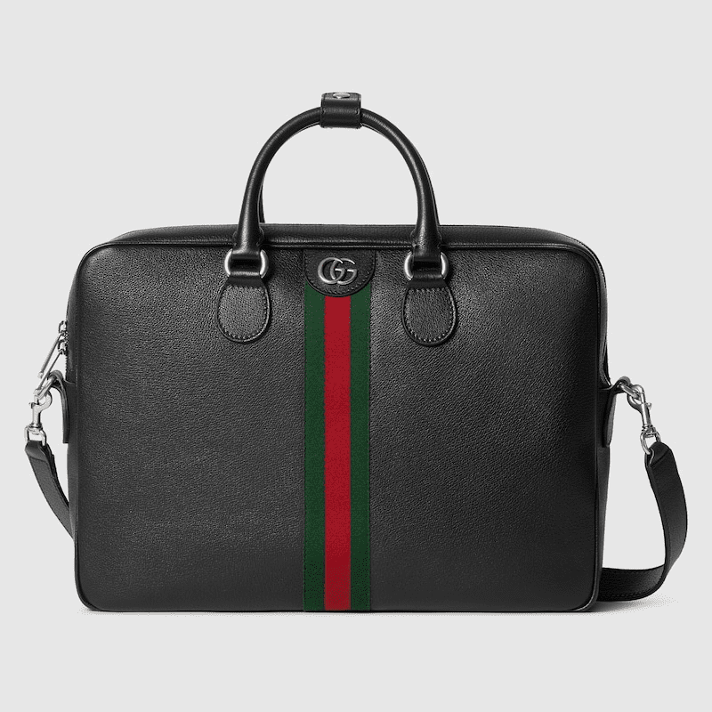 Ophidia in black features sophisticated leather, elevating signature silhouettes with new functions. This briefcase is presented in a soft leather with natural shine and is defined by a Double G and a Web detail.