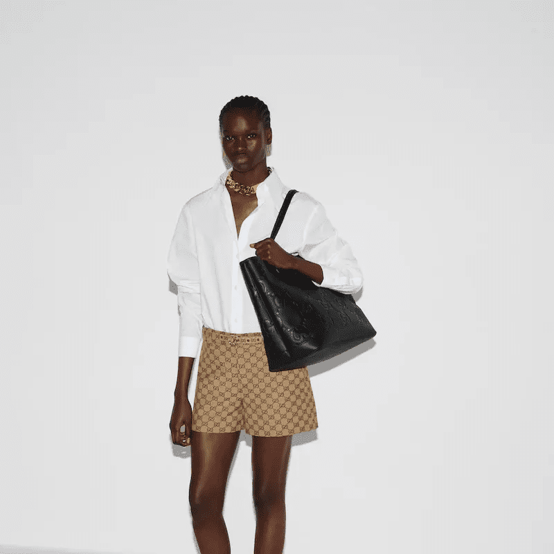 The all-black Super Double G design makes a dazzling return in the Pre-Fall 2023 collection, which is brilliantly interpreted on a variety of leather items. As a renewed interpretation of Guccio Gucci’s initials, the Super Double G pattern is presented in an oversized size, creating a timeless brand logo appeal. This large tote bag is ingeniously embellished with the brand’s iconic pattern.