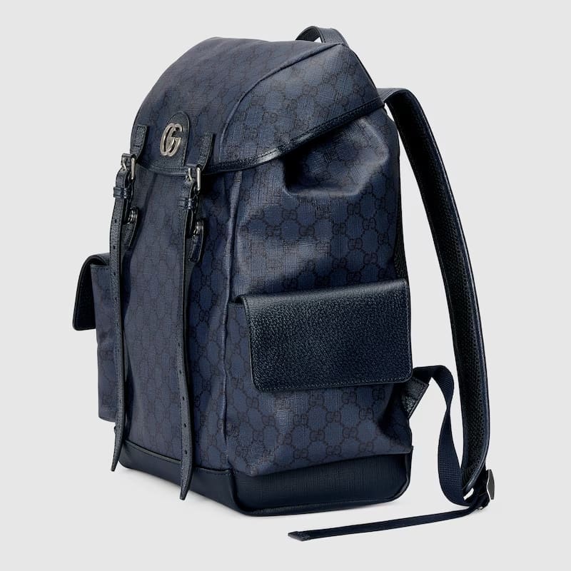 The Ophidia shoulder bags, totes, and top handle bags are presented in GG black denim for Cruise 2024, complete with silver-toned hardware for a touch of metallic contrast. This Ophidia backpack is presented in a blue and black variation of the GG Supreme canvas, reflecting Gucci’s ability to modernize signature design elements.