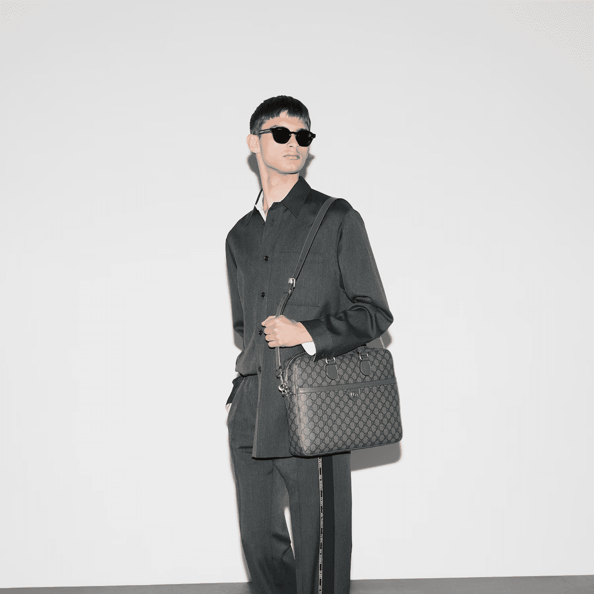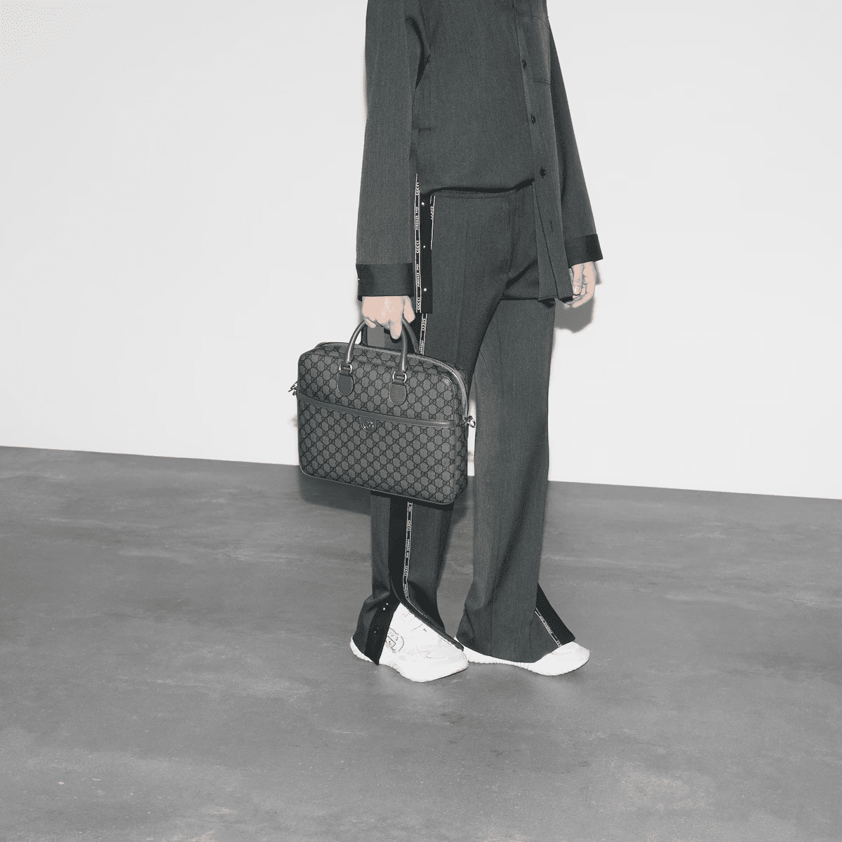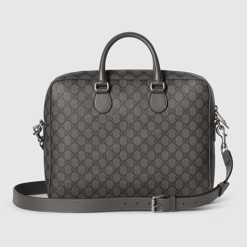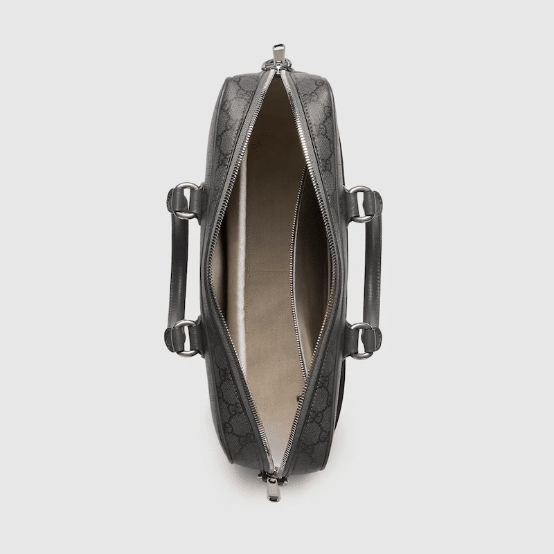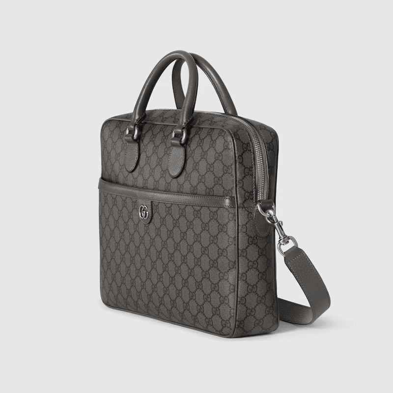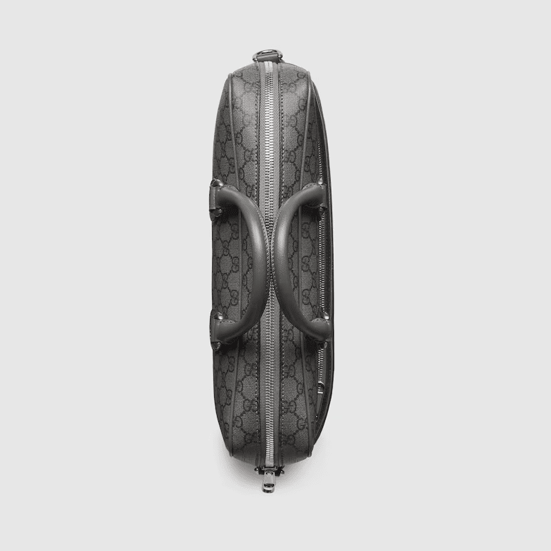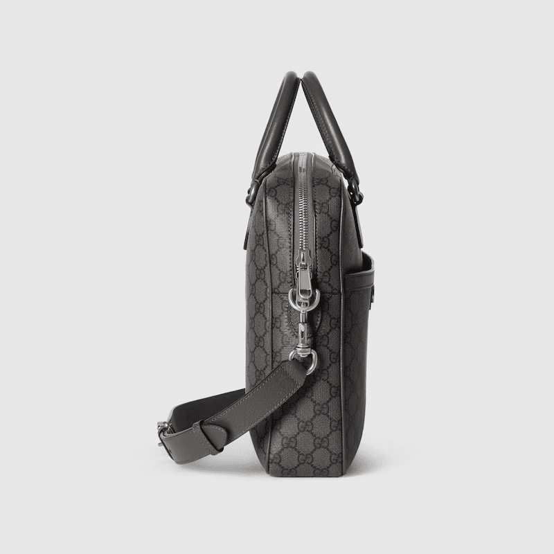 A selection of bags, including mini cross-body bags, briefcases and totes have been reshaped with functional details. Featuring a light construction in a neutral color palette, the GG motif defines each style as an integral design element. As part of the Ophidia line, this dark grey and black GG Supreme canvas briefcase is enriched with the Double G motif.