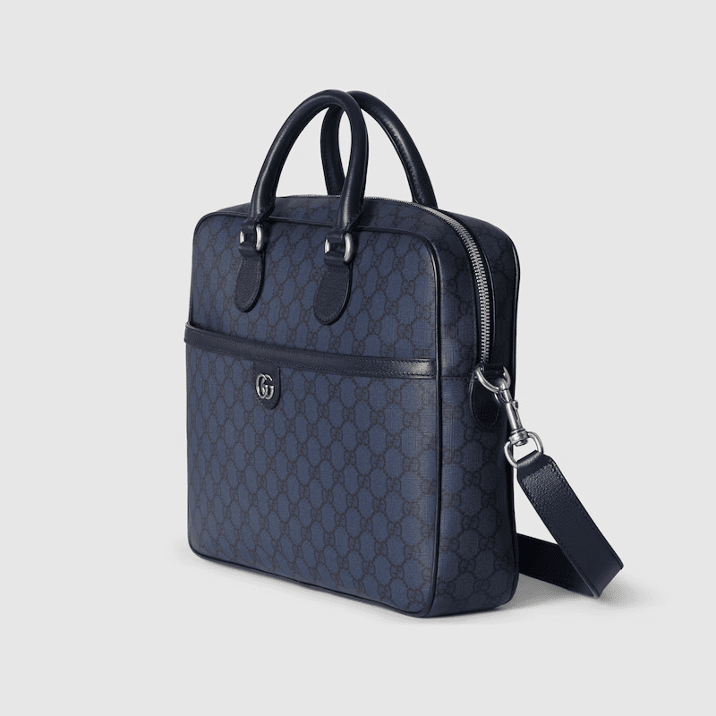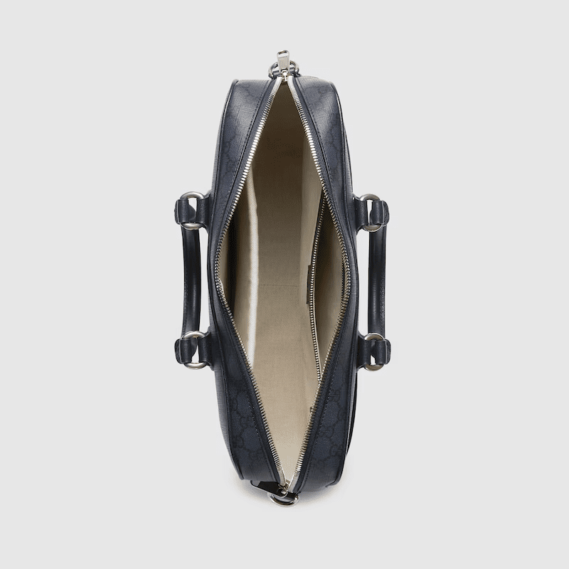 A selection of bags, including mini cross-body bags, briefcases and totes have been reshaped with functional details. Featuring a light construction in a neutral color palette, the GG motif defines each style as an integral design element. As part of the Ophidia line, this tonal blue GG Supreme canvas briefcase is enriched with the Double G motif.