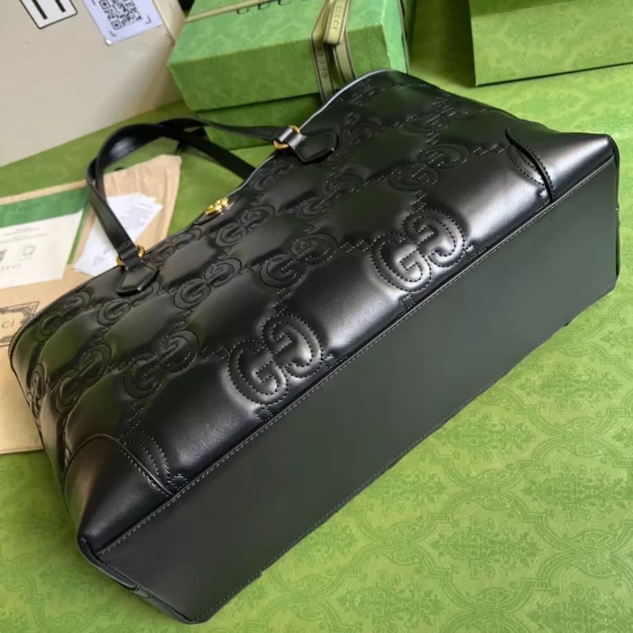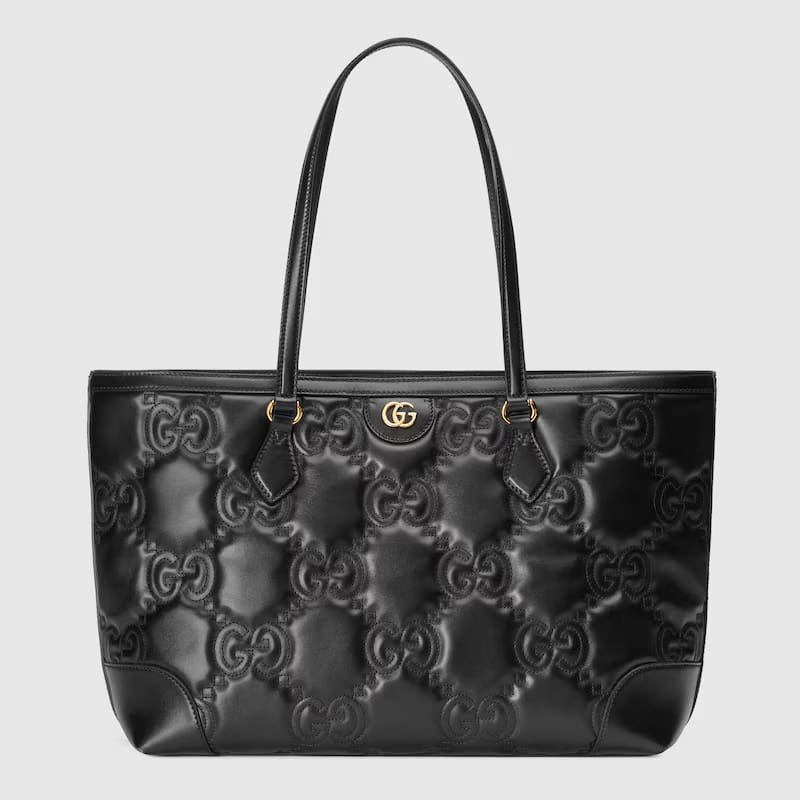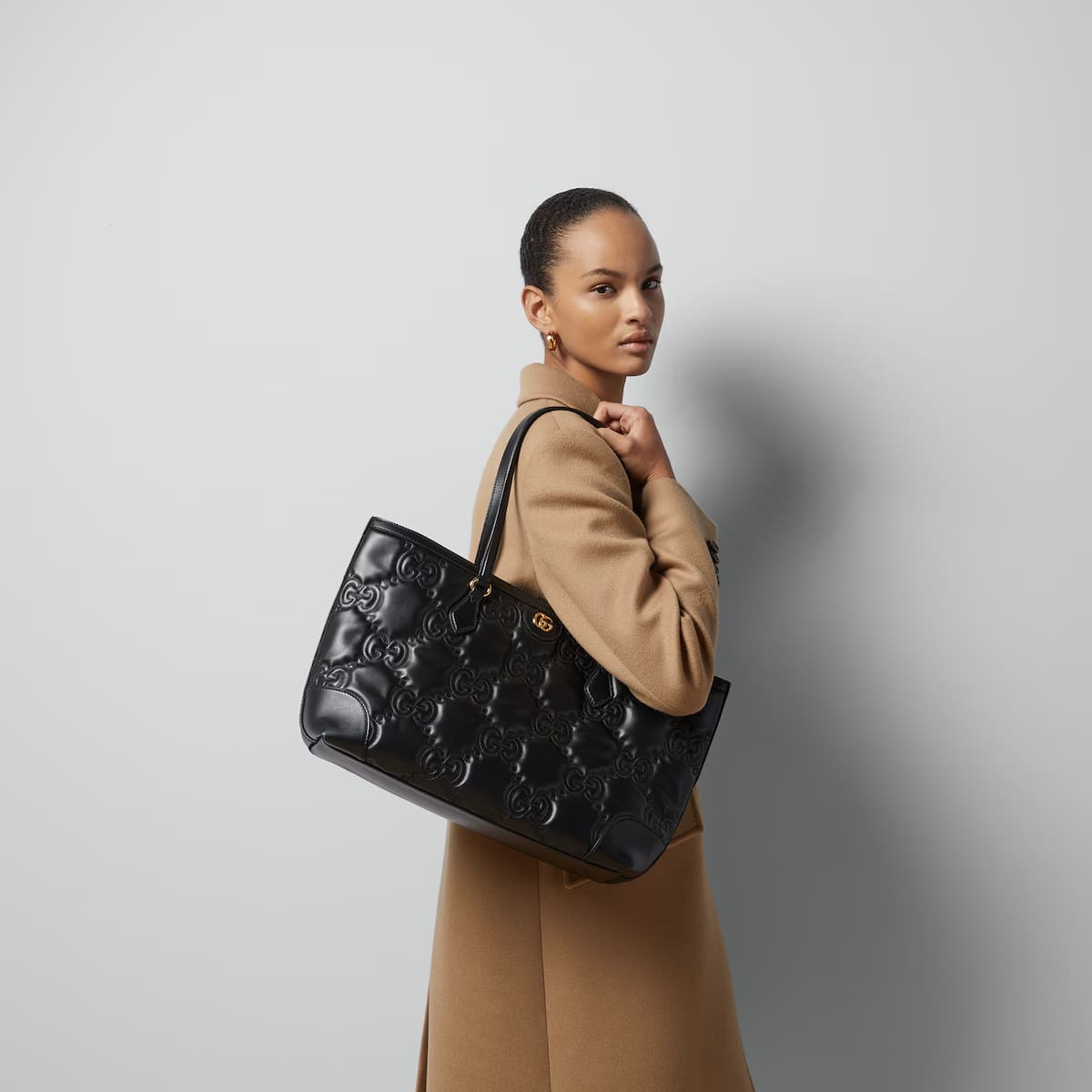 Matelassé leather continues to come to the fore of the Creative Director’s designs in new and unique ways each season. With a super soft finish, the signature material is reimagined once again as a part of Gucci Love Parade with a textured geometric motif. The design presents a contemporary approach to the ’90s logo trend that appears throughout the House’s latest collections. Here, it defines a medium-size tote in black.