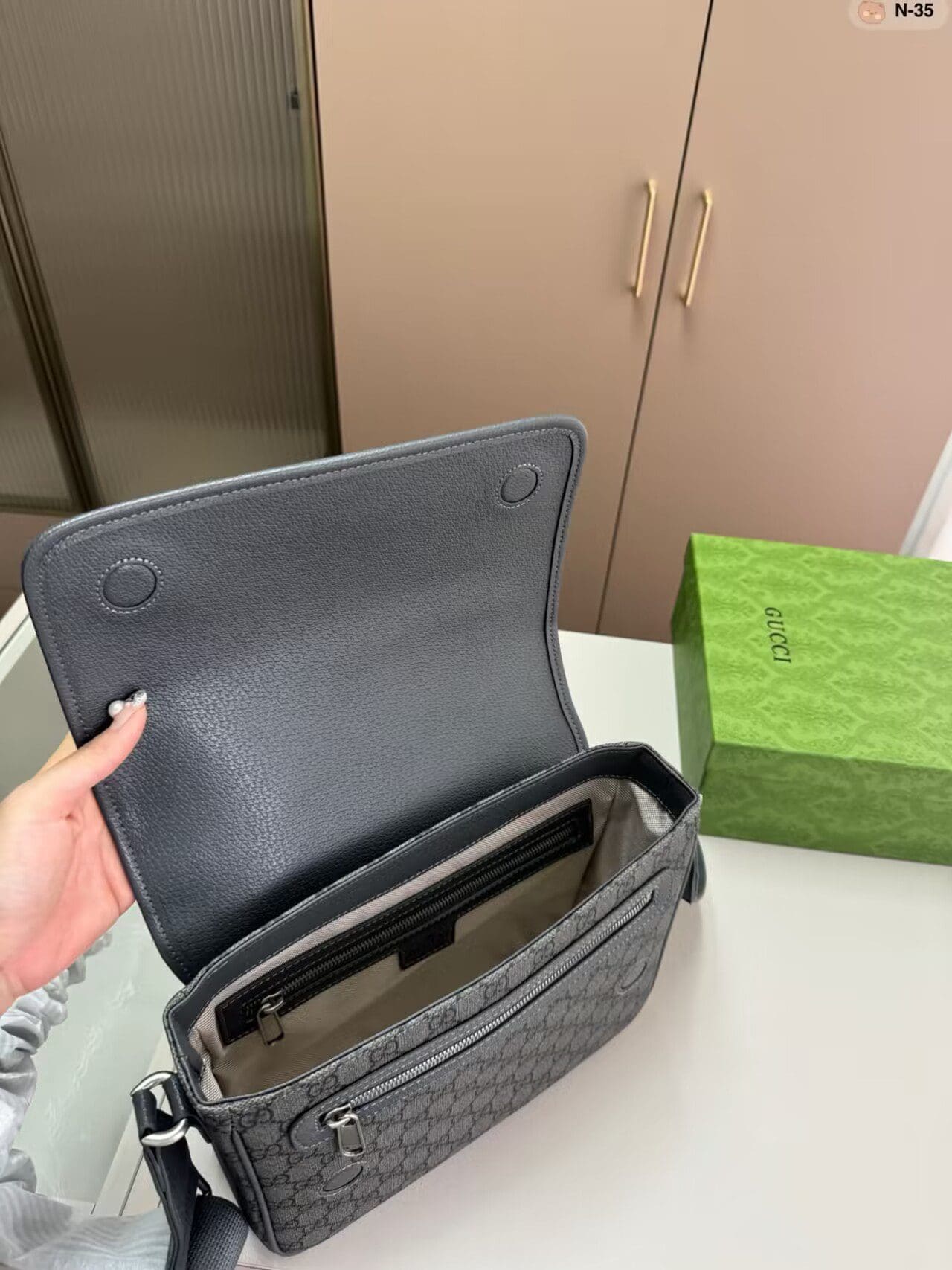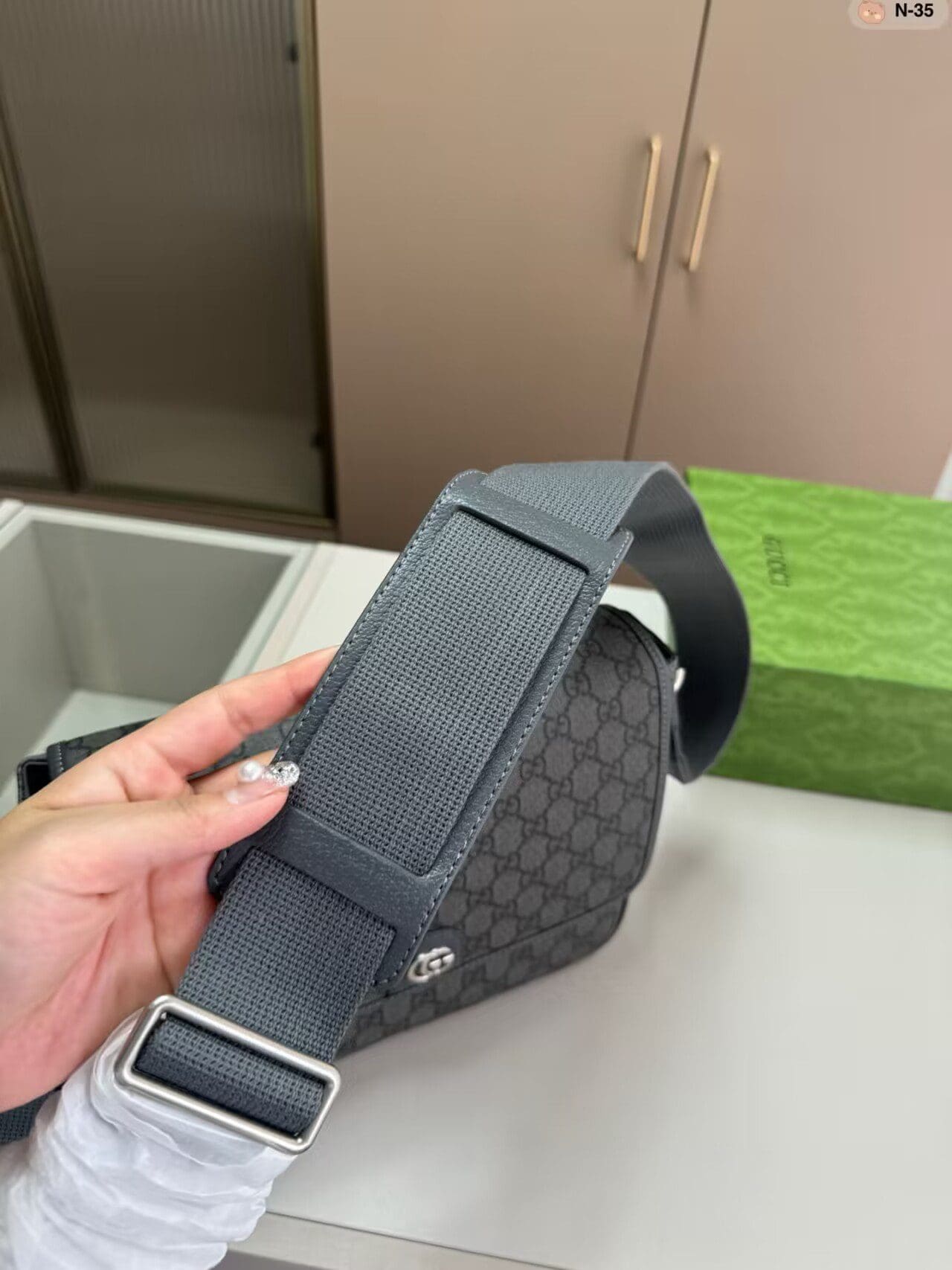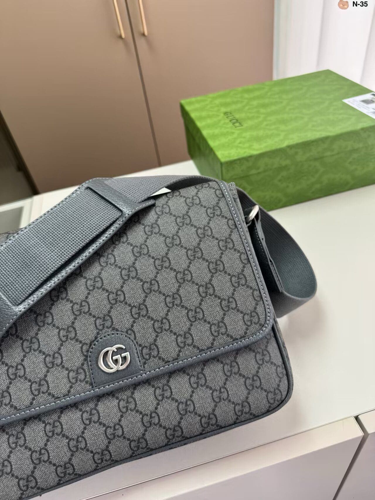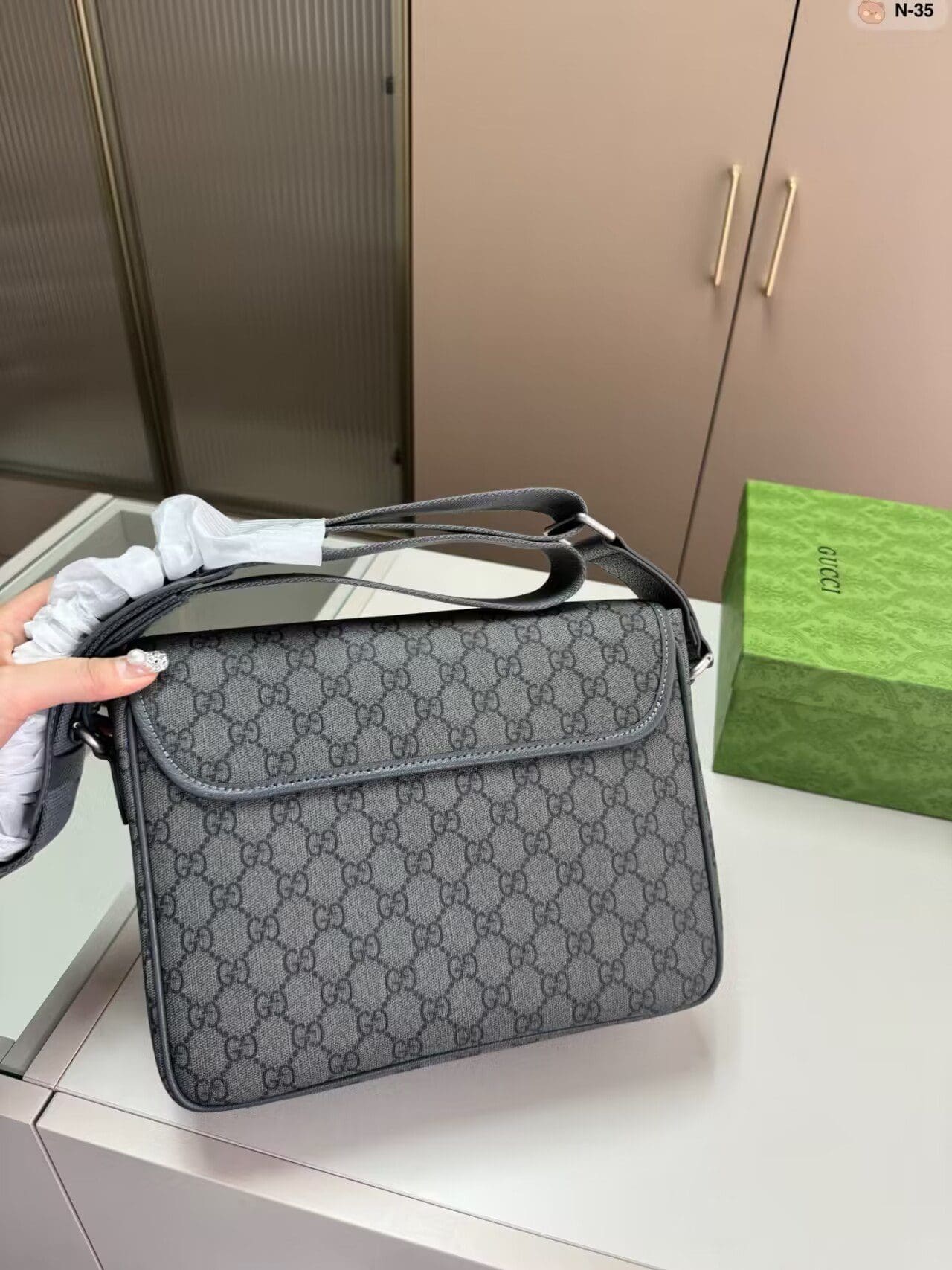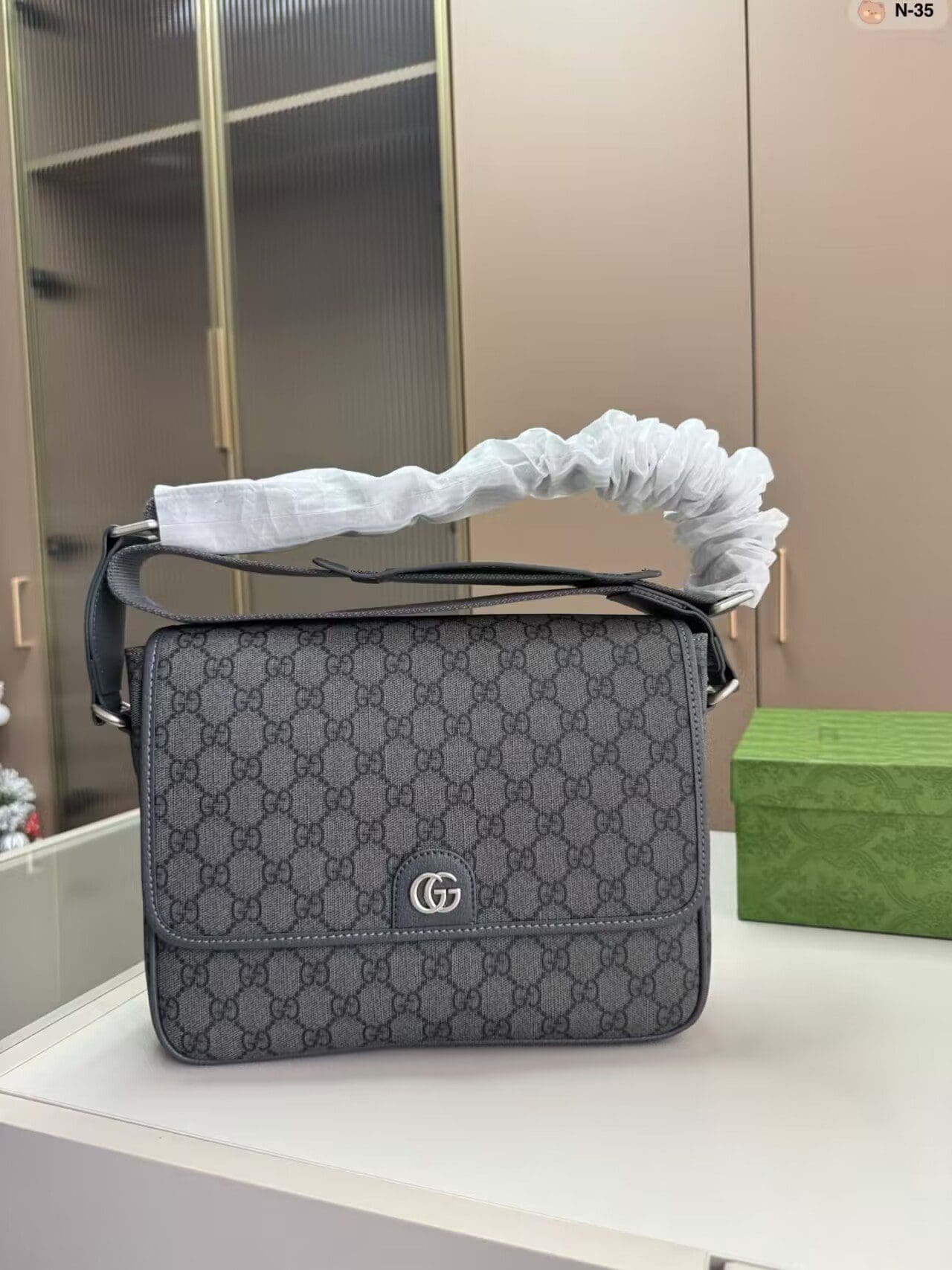 The GG Supreme Tender canvas, with its soft material and durable characteristics, lends itself well to the men’s accessories line, adding a modern feel to established House designs. This Ophidia messenger bag is presented in a grey and black variation of the GG Supreme Tender canvas, complete with the Double G hardware.