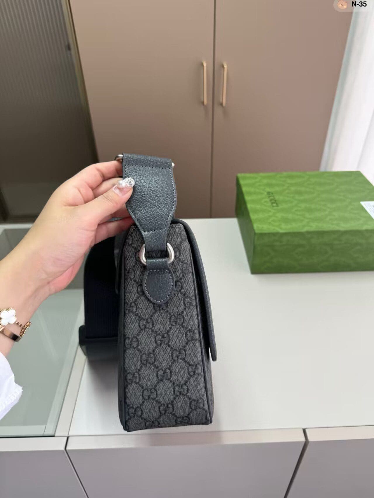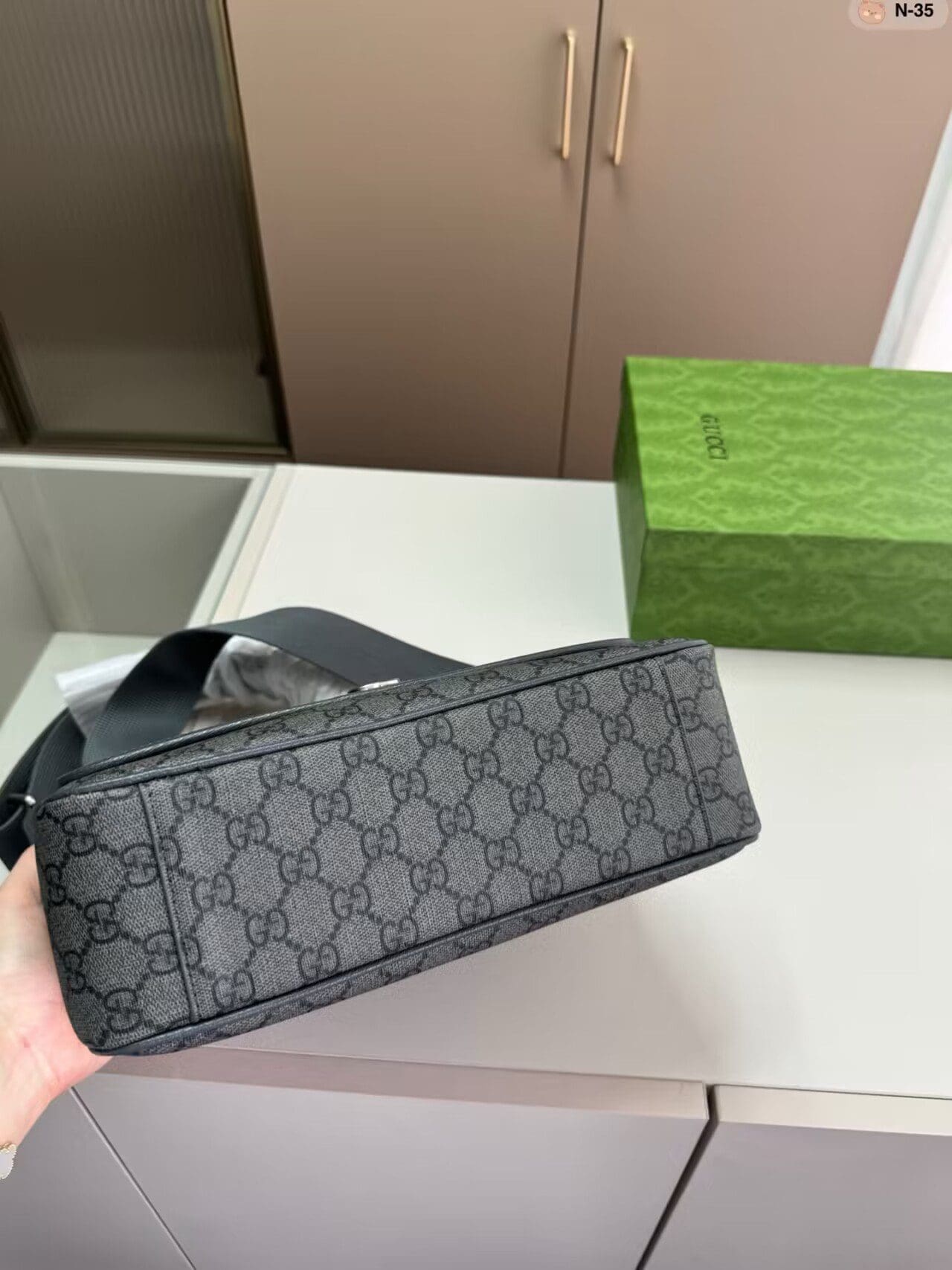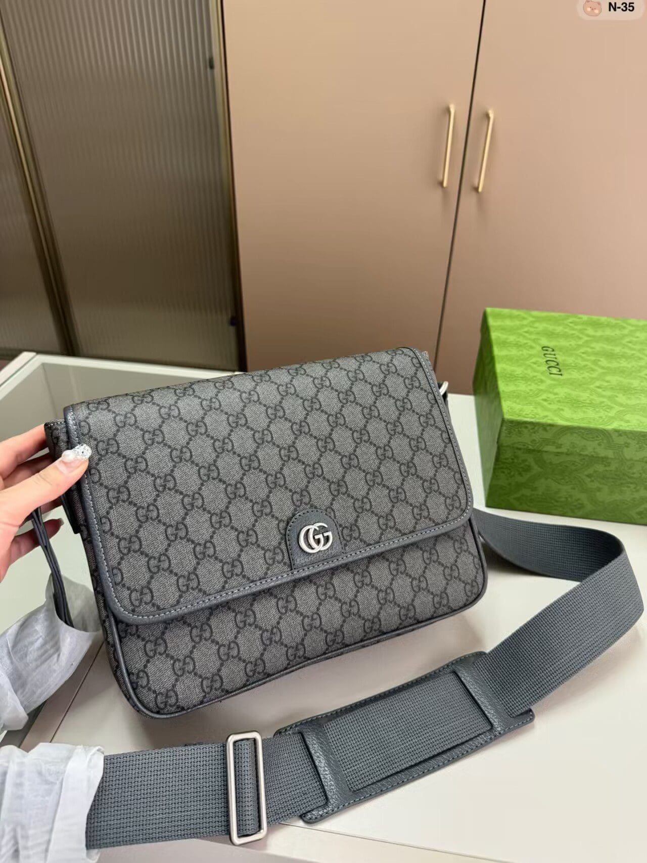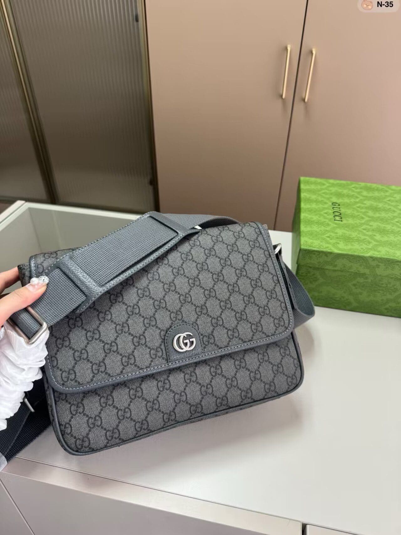 The GG Supreme Tender canvas, with its soft material and durable characteristics, lends itself well to the men’s accessories line, adding a modern feel to established House designs. This Ophidia messenger bag is presented in a grey and black variation of the GG Supreme Tender canvas, complete with the Double G hardware.