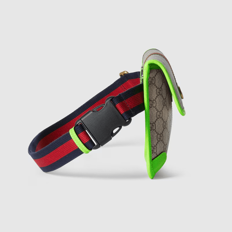 Reflecting the Creative Director’s contemporary vision, the Ophidia lines come to life with a pop of fluorescent green. Combining the GG motif and Web stripe with a modern hue launches signature travel pieces into the metropolis, such as this small belt bag.