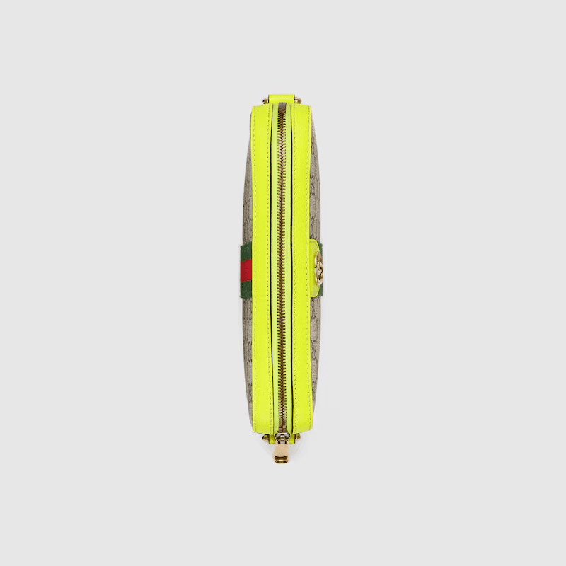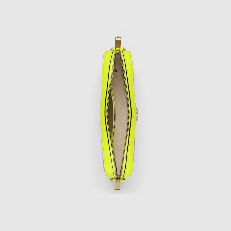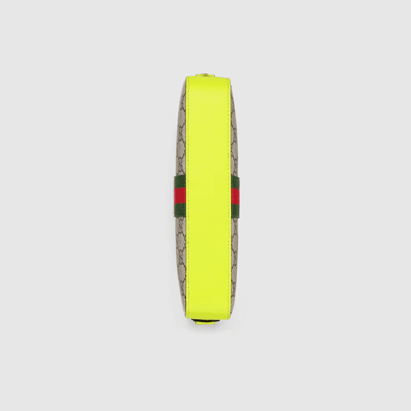 Inspired by the summer spirit and beach clubs on the Italian coast, this item is part of Gucci Lido. Reflecting the Creative Director’s contemporary vision, the Ophidia lines come to life with a pop of fluorescent yellow. Combining the GG motif and Web stripe with a modern hue launches signature travel pieces into the metropolis, such as this crossbody bag complete with a second Web detail.