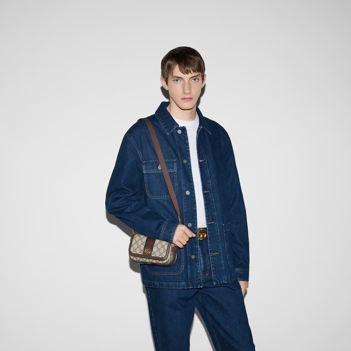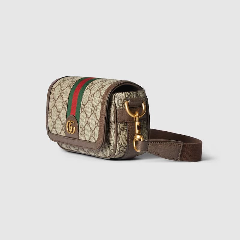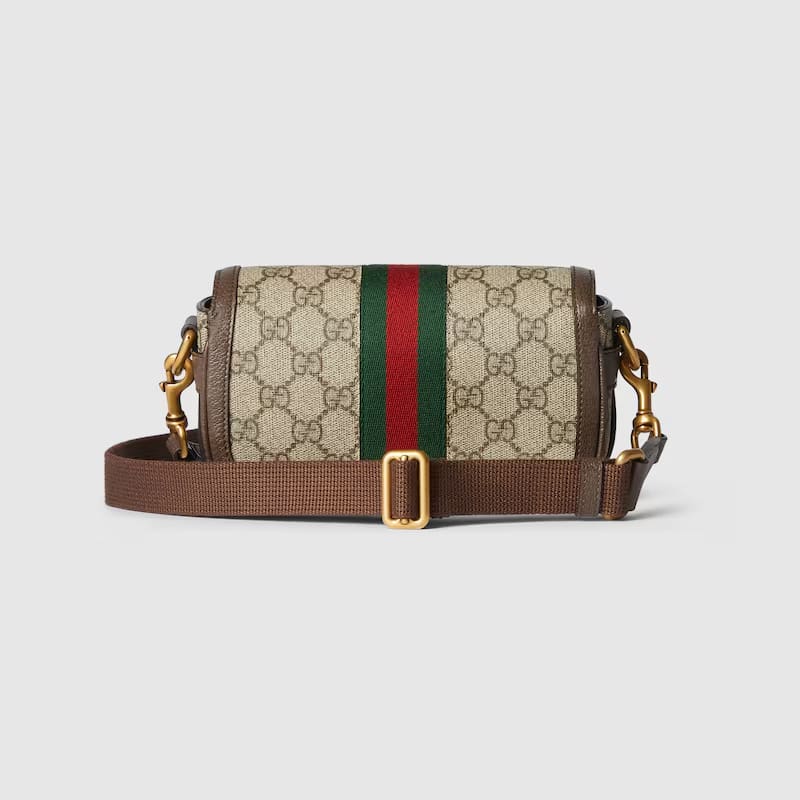 A selection of bags, including mini cross-body bags, briefcases and totes have been reshaped with functional details. Crafted from beige and ebony GG Supreme canvas, this Ophidia super mini bag features one inside zip pocket, while the outside shows off the Double and Web stripe.