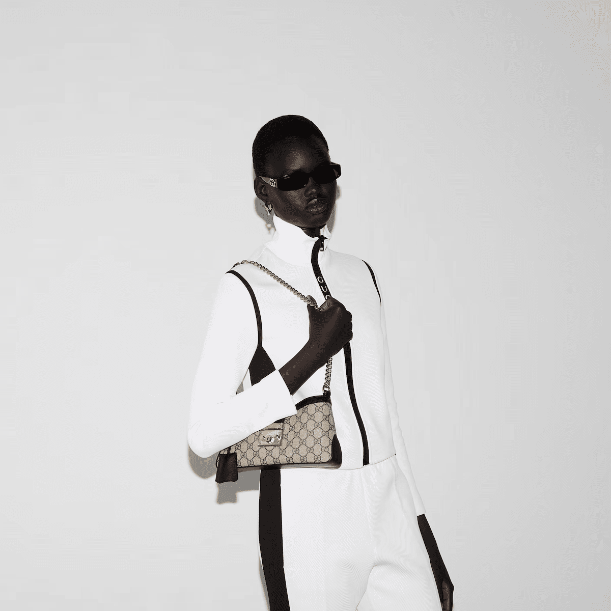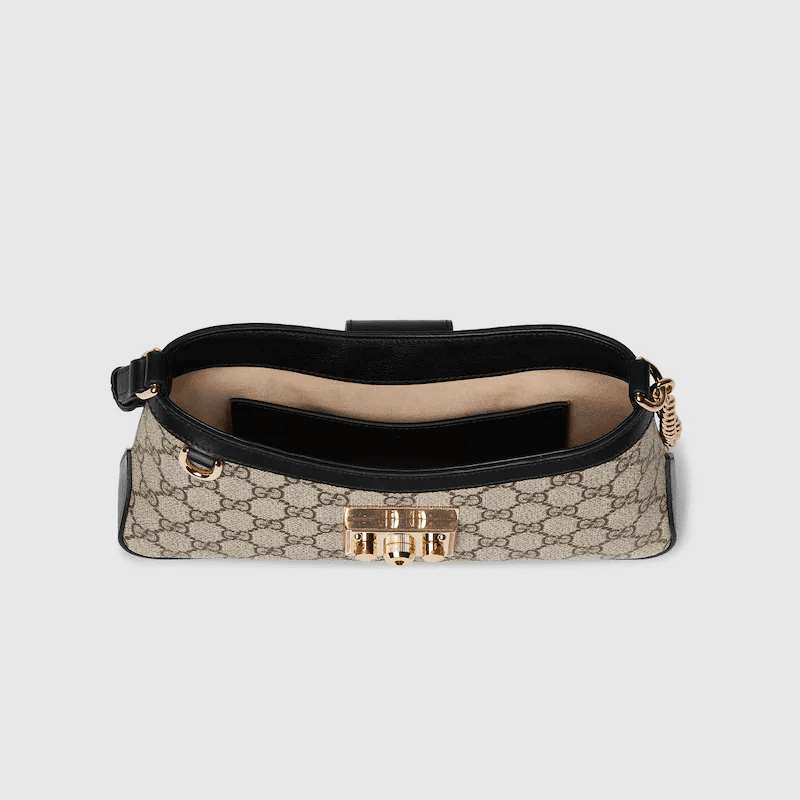 Drawing from the House’s origins as an artisanal luggage atelier, the Padlock closure features prominently on this small shoulder bag in beige and ebony GG Supreme canvas, with black leather trim, and a new adjustable leather and chain strap. It is complete with gold-toned hardware and key with leather holder.