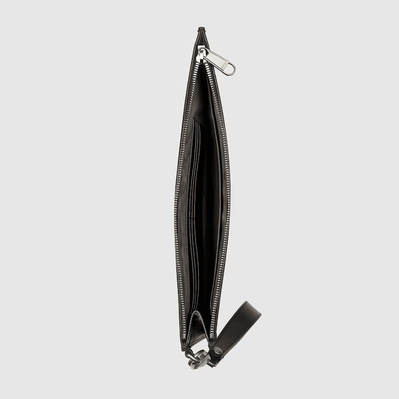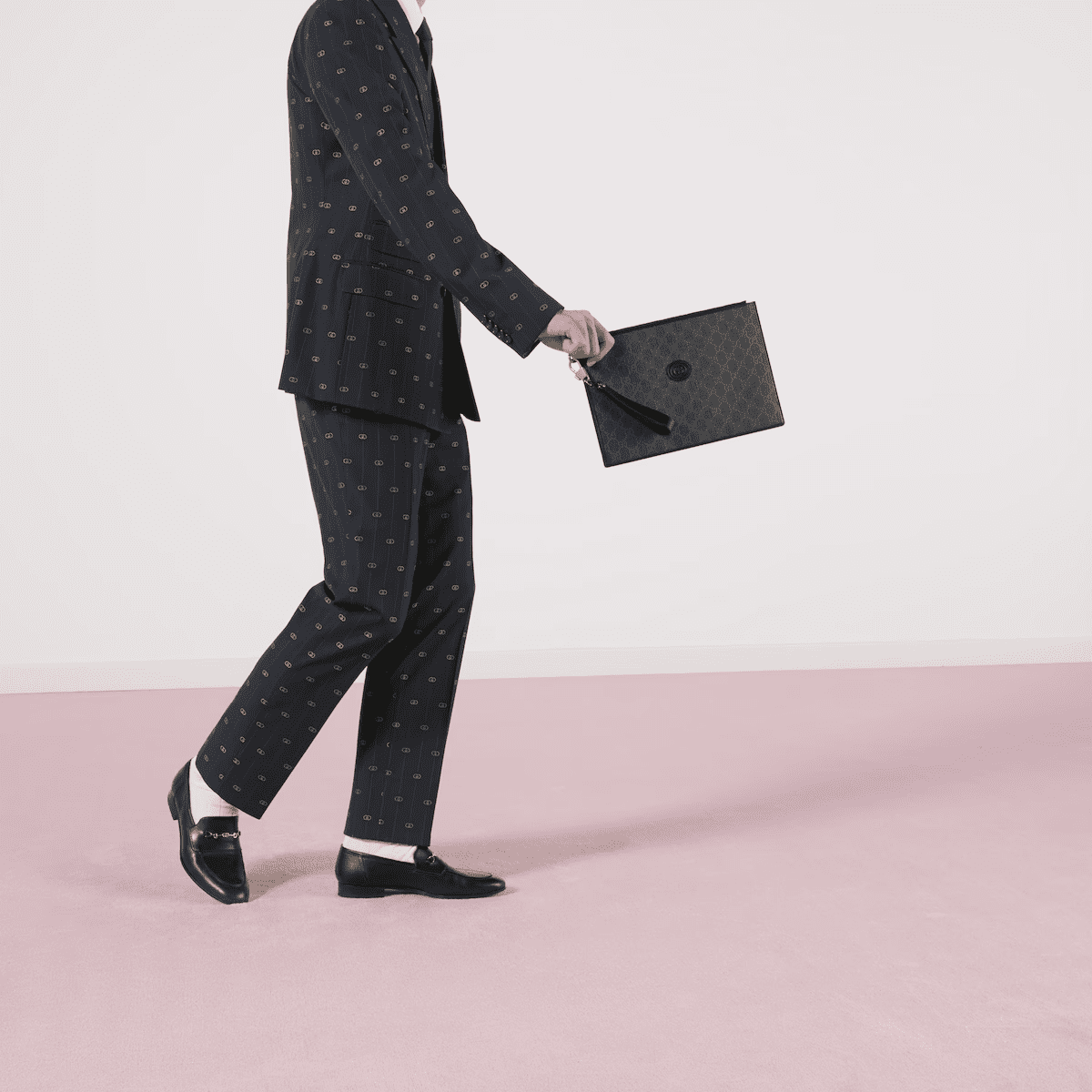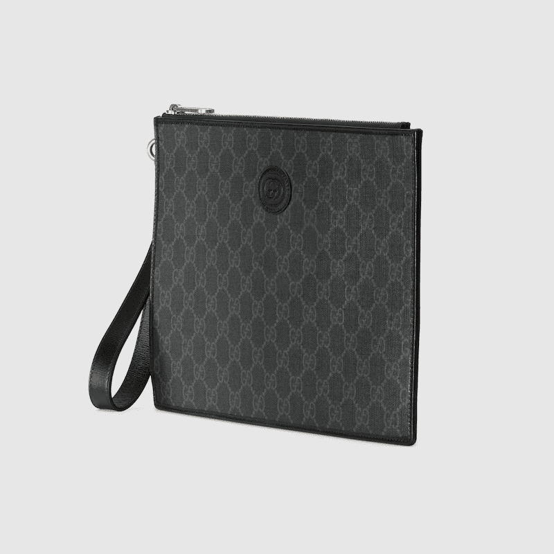 Gucci Aria presents heritage elements like the GG motif and equestrian-inspired accessories within a collection that lingers over the edge of the beginning. Inspired by the archives, this pouch is presented in black GG Supreme canvas and enriched by a tonal leather trim and Interlocking G tag.