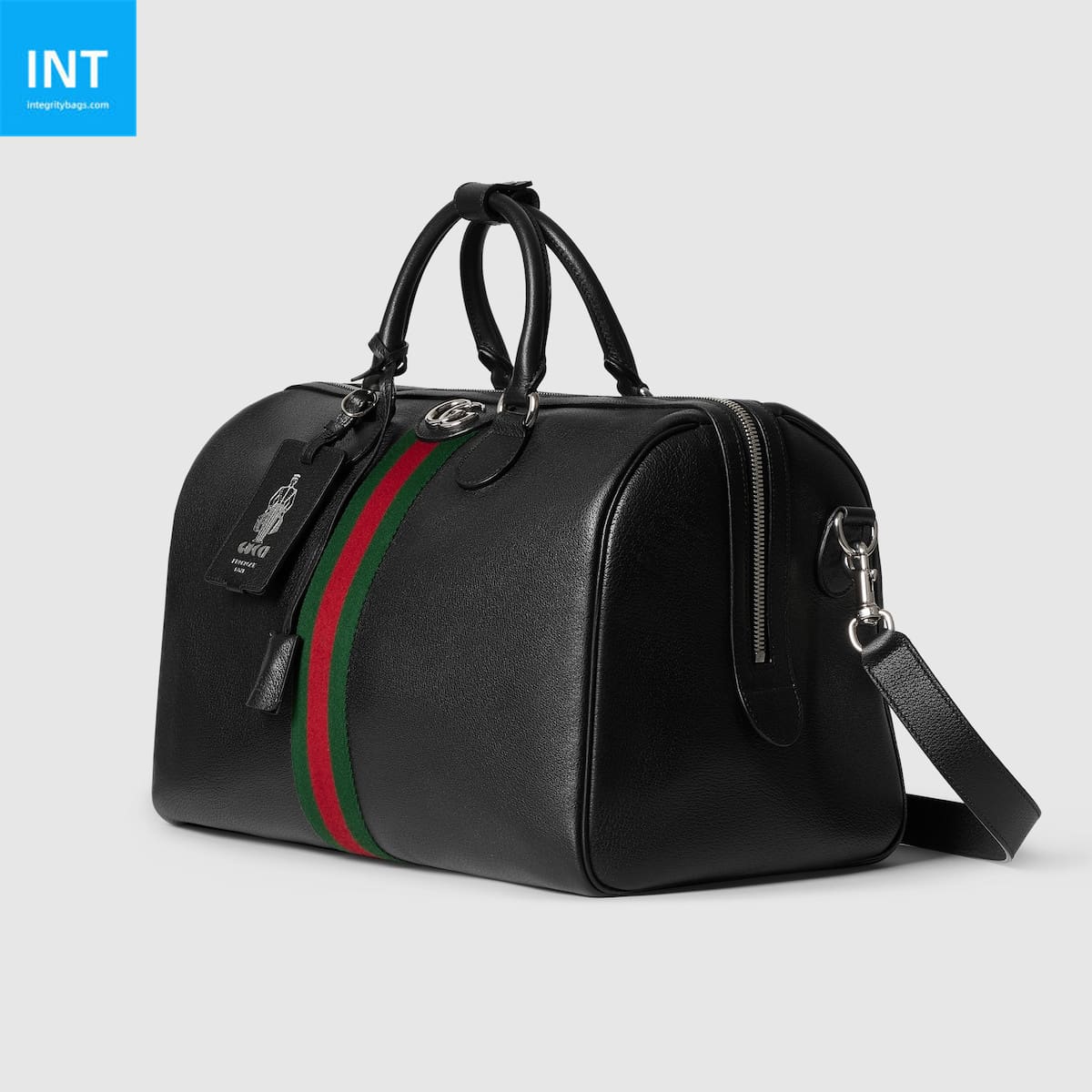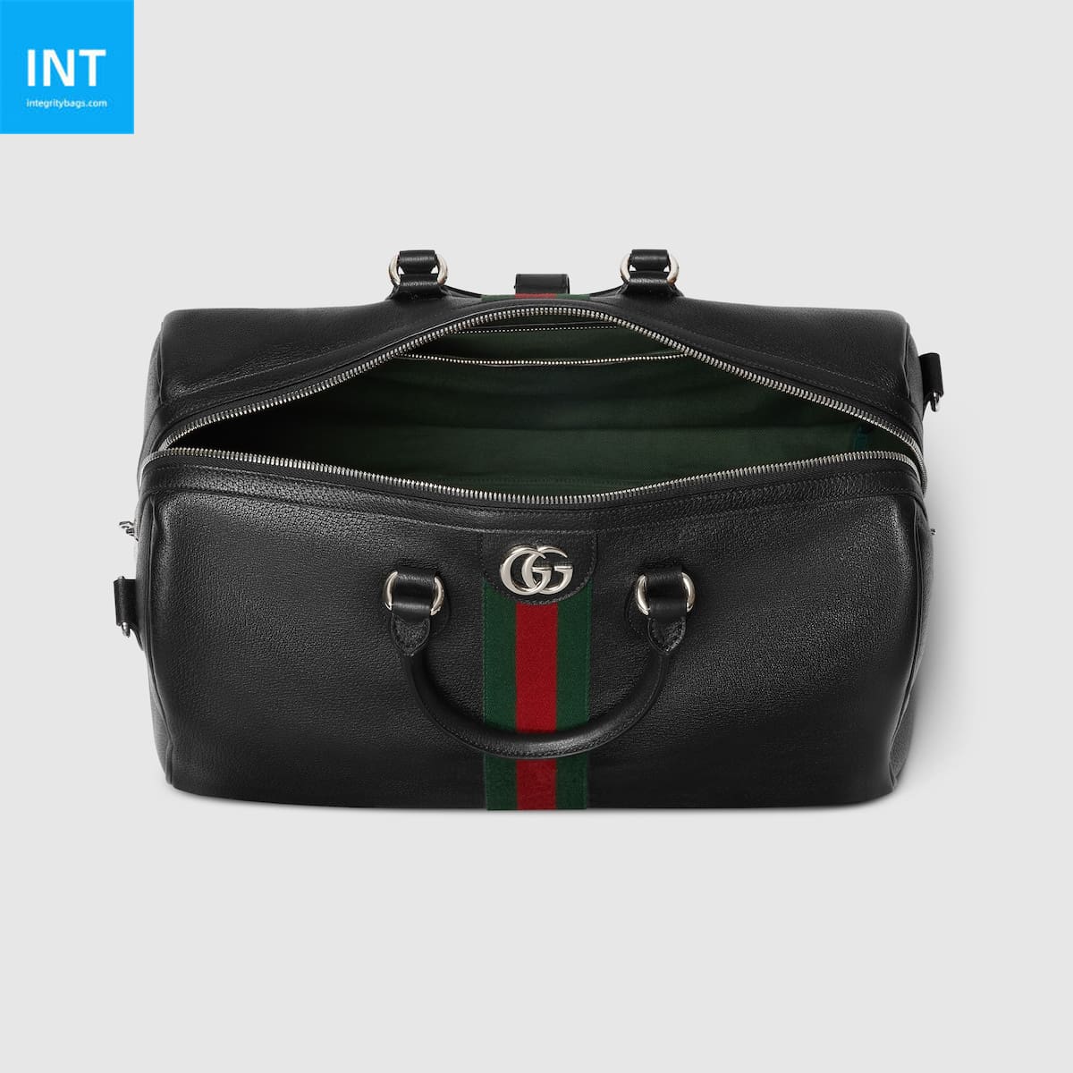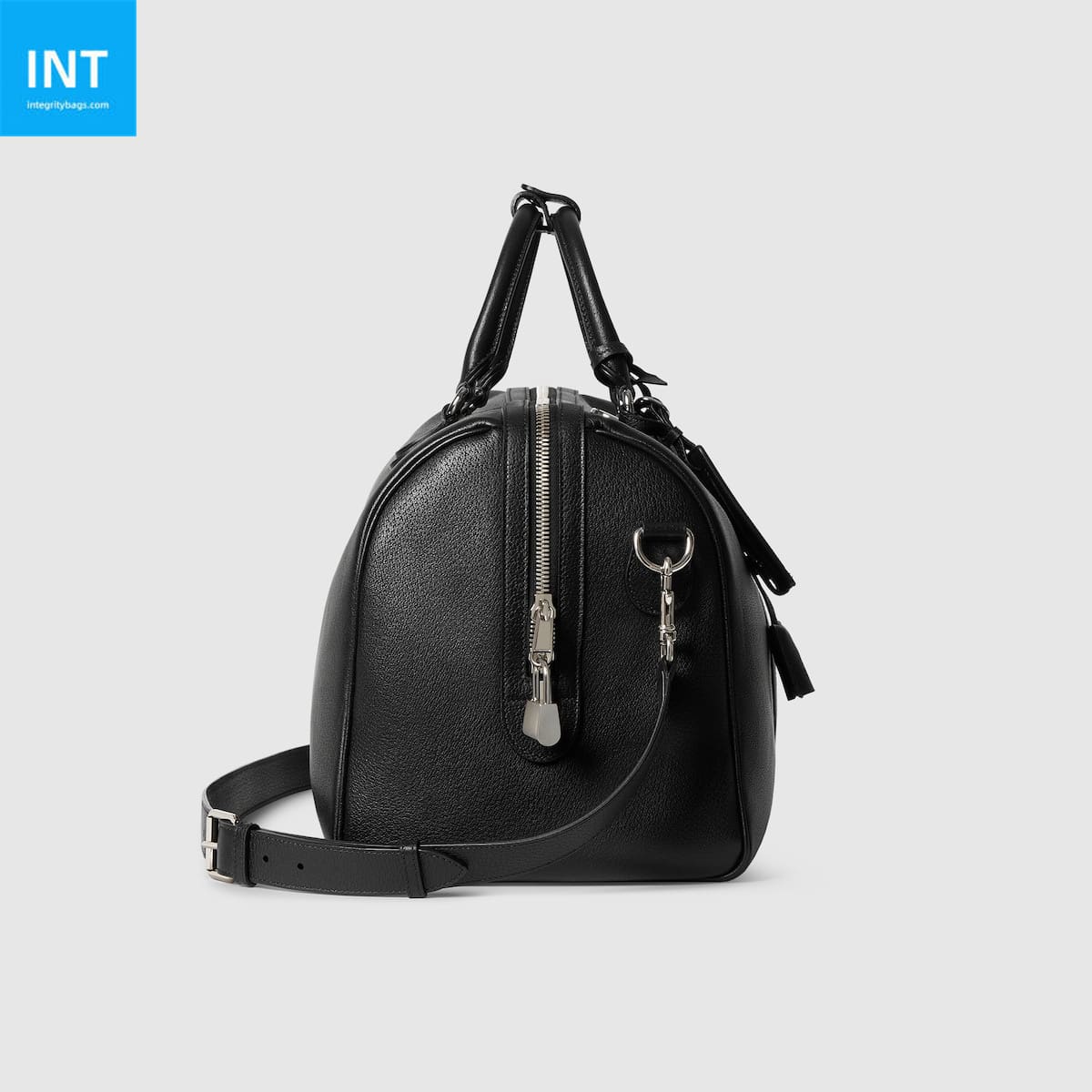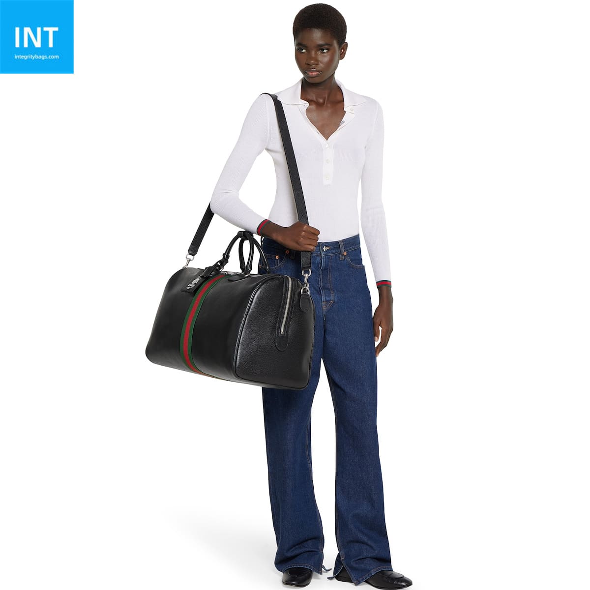 Gucci Savoy in black features sophisticated leather, elevating signature silhouettes. This duffle bag is presented in a soft leather with natural shine, revealing a Double G and Web detail.